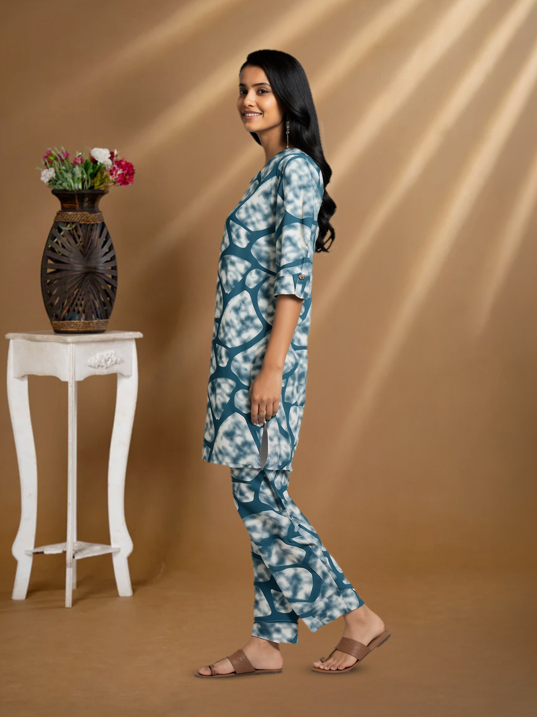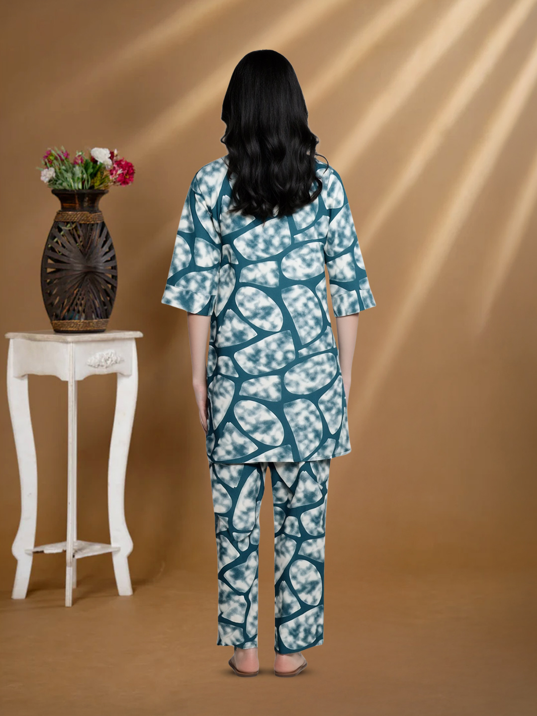 Make a stylish statement with this Abstract Printed Top and Palazzo Co-Ord Set. The striking print is balanced by the simple cut of the outfit, giving you a trendy yet wearable look. Ideal for casual outings, creative workplaces, or laid-back festive gatherings.