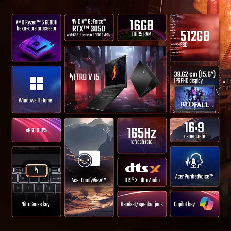 Powered by the AMD Ryzen 5 6600H processor and NVIDIA GeForce RTX 3050, the Nitro V ensures fast, fluid gameplay with lifelike graphics and minimal lag, even in high-intensity scenarios.