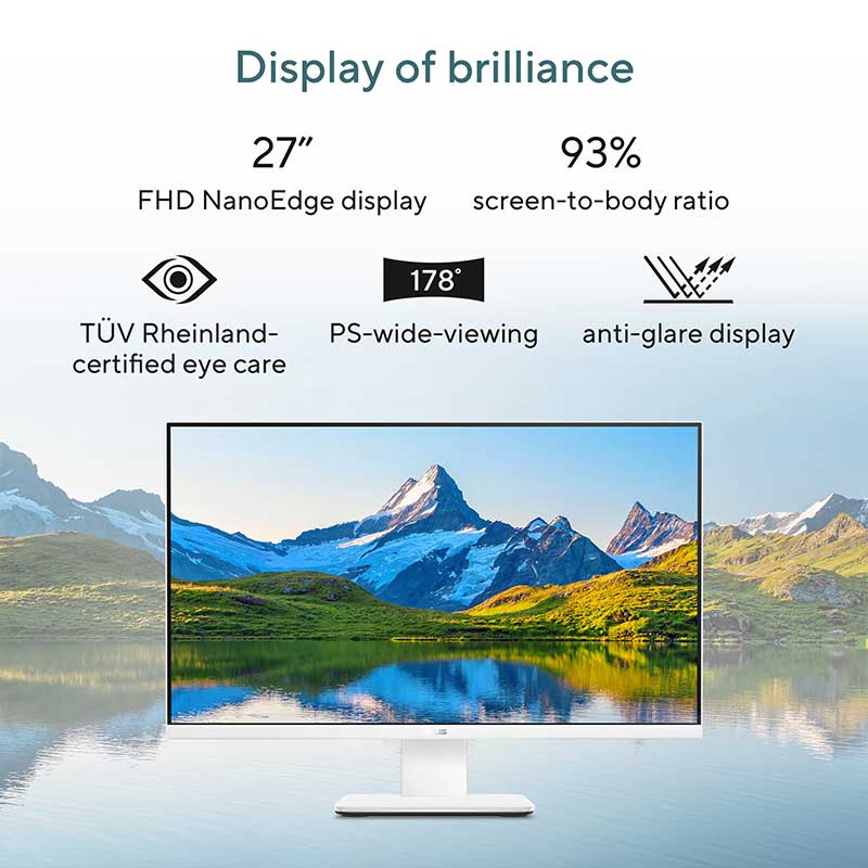 The 27-inch (68.58 cm) display delivers crisp visuals and vibrant colors, making it perfect for work, streaming, and creative projects. Its sleek edge-to-edge design complements any modern workspace.