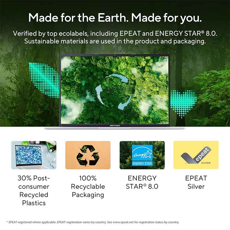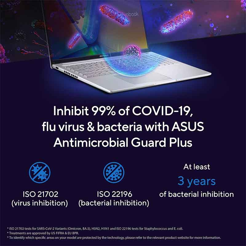 ASUS Antimicrobial Guard Plus is applied to frequently touched areas of your laptop to help keep it hygienic. This technology uses a denser treatment* that inhibits viruses and bacteria.