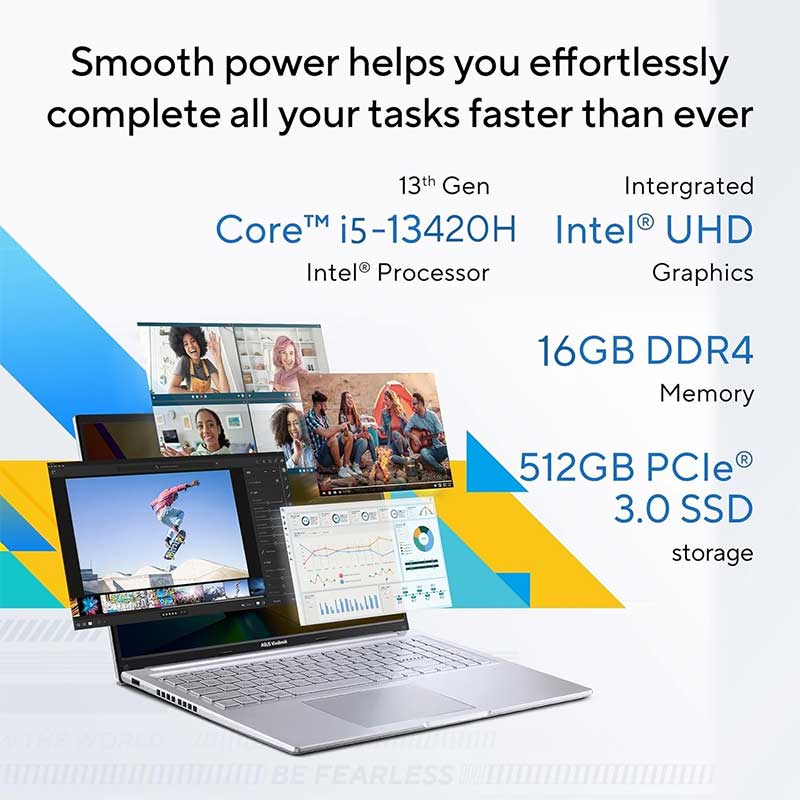 Vivobook 16 helps you complete all your tasks faster than ever, whether it’s at work, at home, or out and about. Upto 13th Gen Intel Core processors with DDR4 memory, PCIe 4.0 SSD speedy SSD storage, and WiFi 6E make everything effortless.