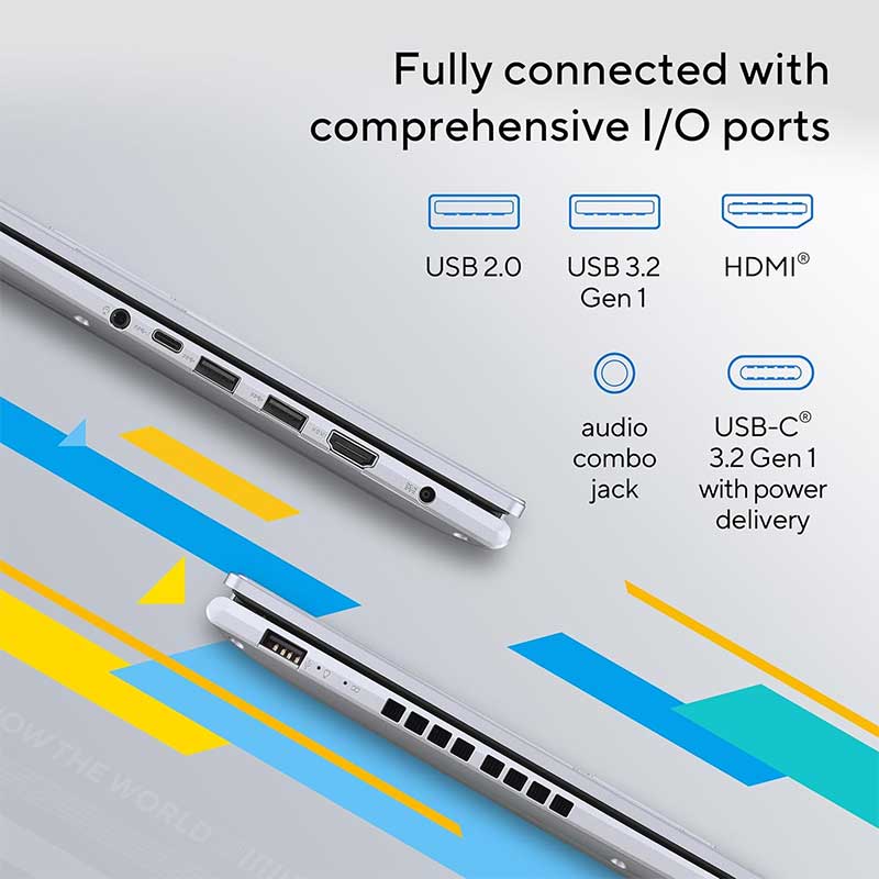 Vivobook 16 keeps you fully connected with its comprehensive I/O ports. There are a USB-C 3.2 Gen 1 PD port, two USB 3.2 Gen 1 Type-A ports, a USB 2.0 port, HDMI output, and an audio combo jack — so it’s easy to connect all your existing peripherals, displays, and projectors.