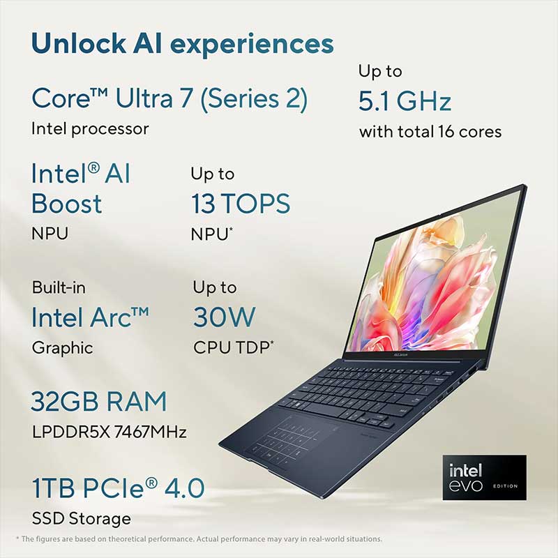 With 32GB of RAM and a 1TB SSD, the Zenbook 14 OLED offers lightning-quick responsiveness and ample storage for all your projects, media, and files. The Intel Arc Graphics enhance your creative workflows, enabling smooth video editing, gaming, and 3D rendering with ease.