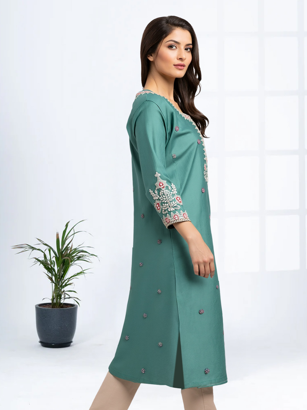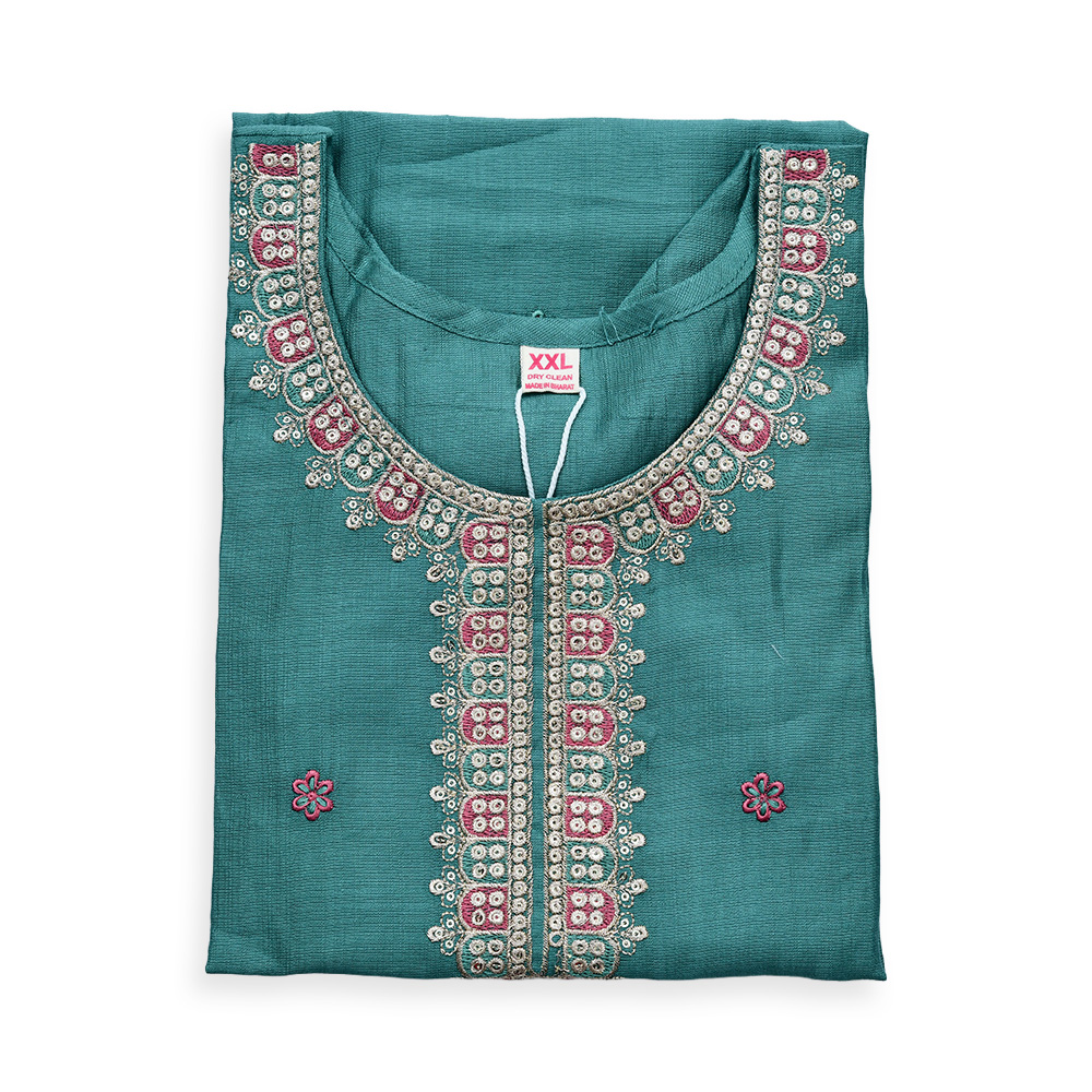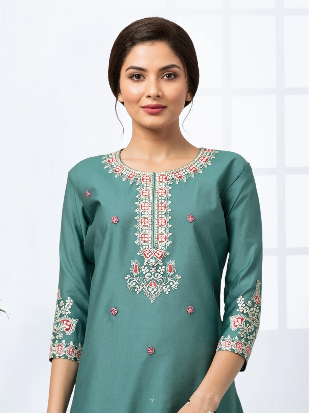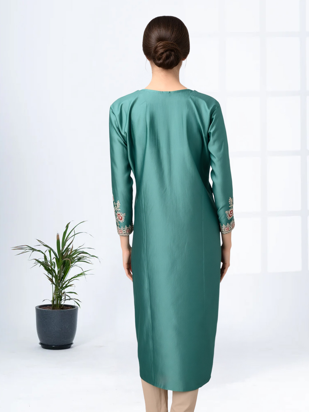 Made with high-quality, soft fabric, this kurta ensures you stay comfortable while looking stylish. The 3/4 sleeves with floral embroidery and round neckline create a perfect balance of tradition and modernity. A wardrobe essential for versatile wear.