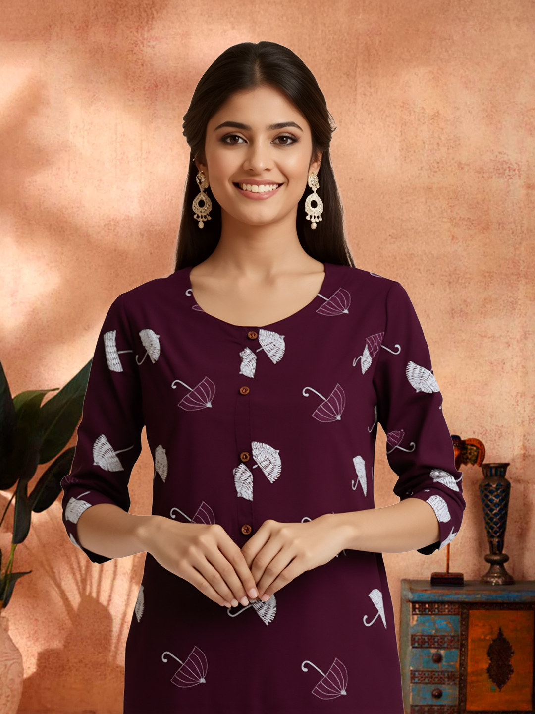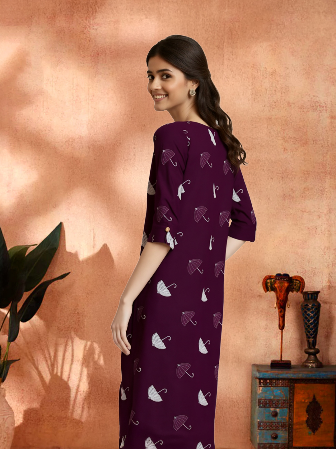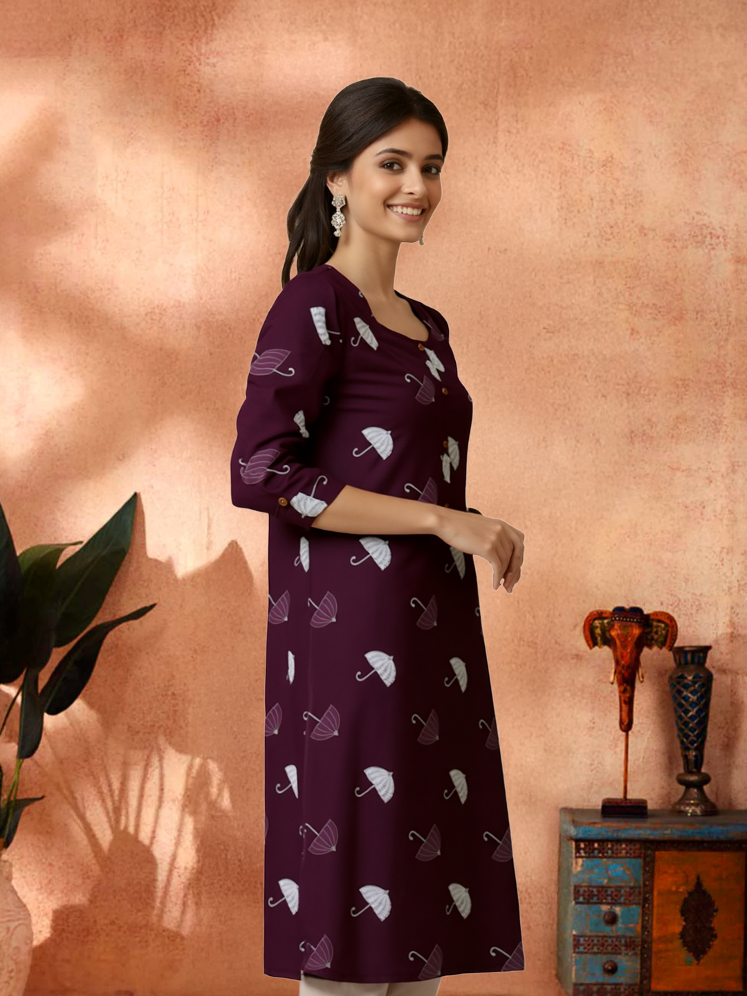 Bring a smile to your style with this Charming Umbrella Printed Kurta. Made from a soft, lightweight fabric, it offers both comfort and breathability. The rounded neckline, adorned with a subtle button placket, adds a sophisticated touch to the playful umbrella print. Whether you're enjoying a sunny day or relaxing in the evening, the stylish 3/4 sleeves complete this easygoing yet elegant look.