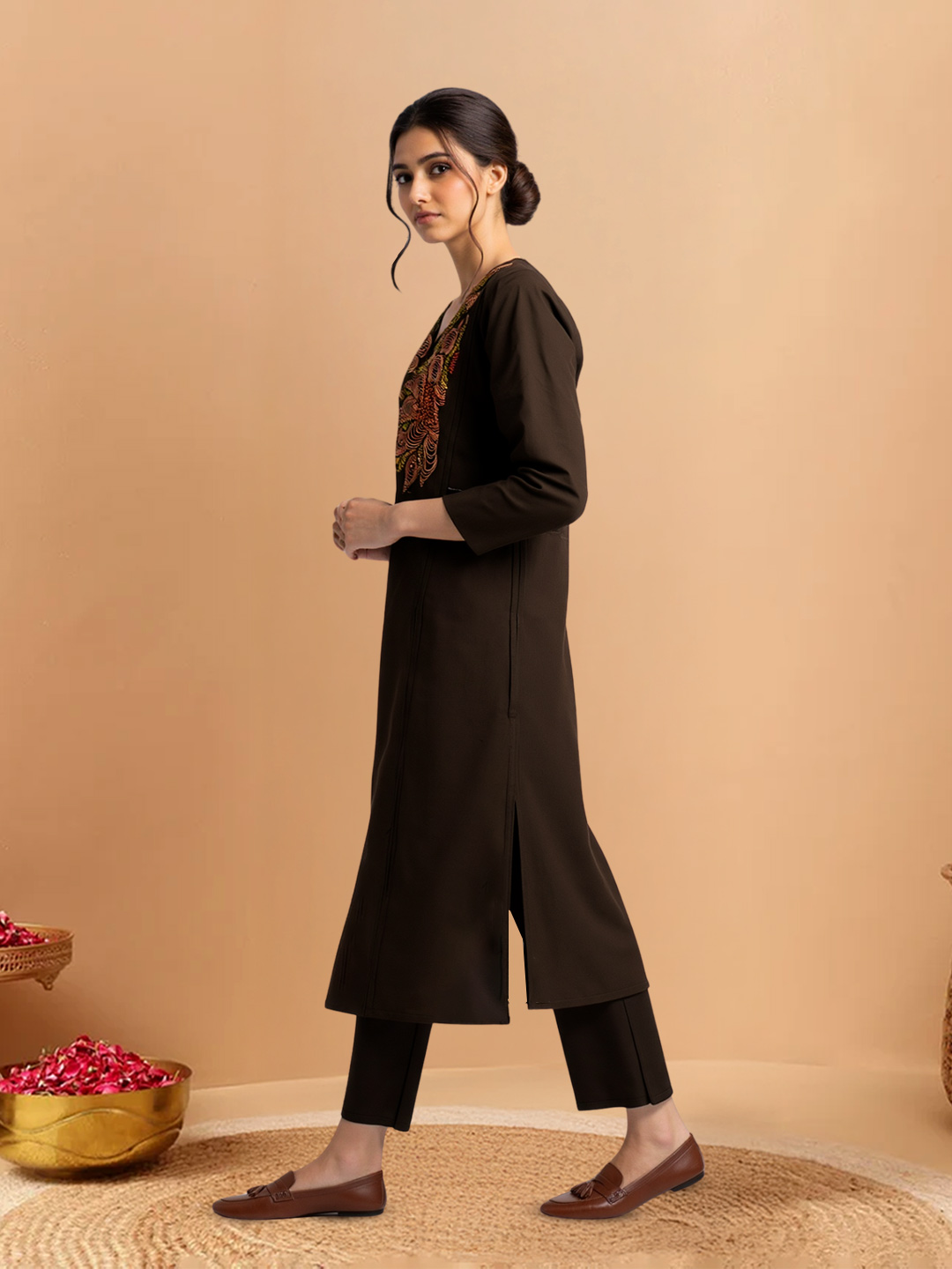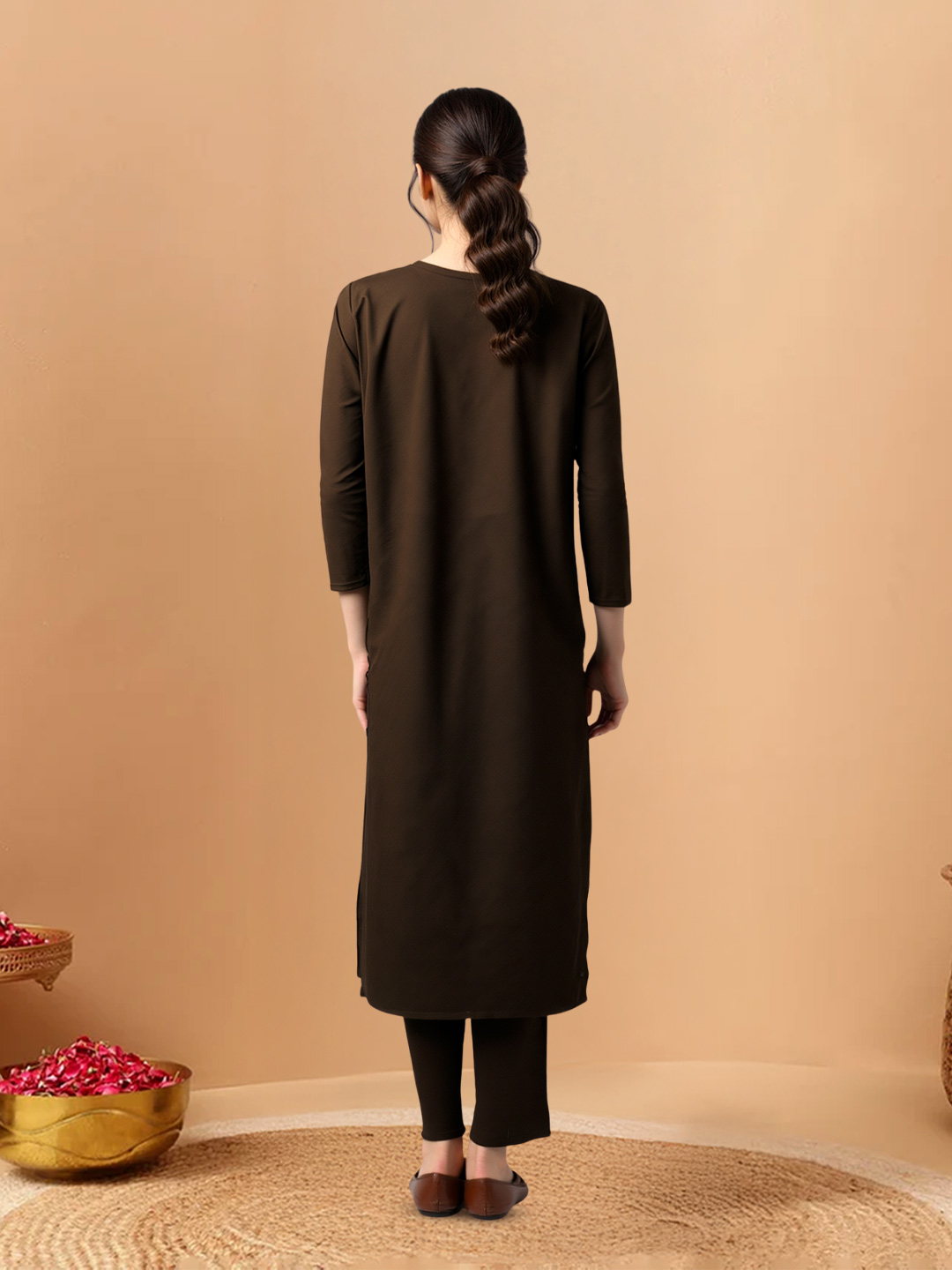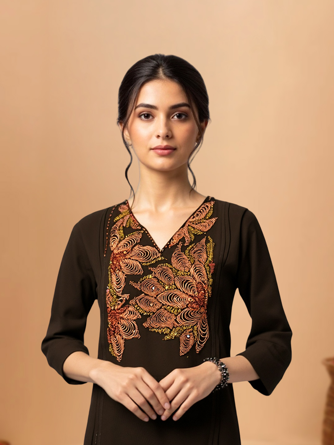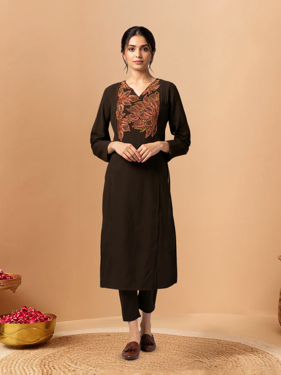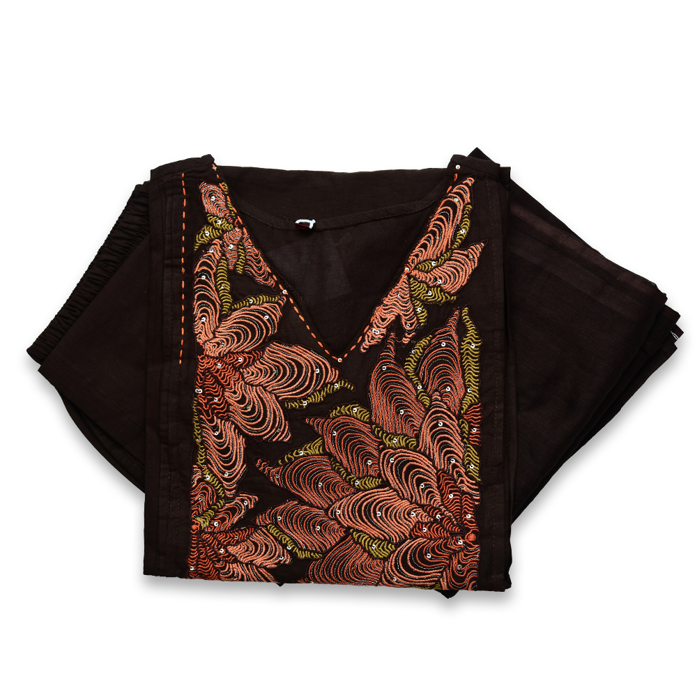 This salwar suit set blends elegance and ease with delicate front embroidery that highlights the V-neckline. The three-quarter sleeves offer a modern yet traditional appeal, while the coordinated bottom and dupatta enhance the outfit’s overall charm. Lightweight fabric ensures all-day comfort without compromising on style.