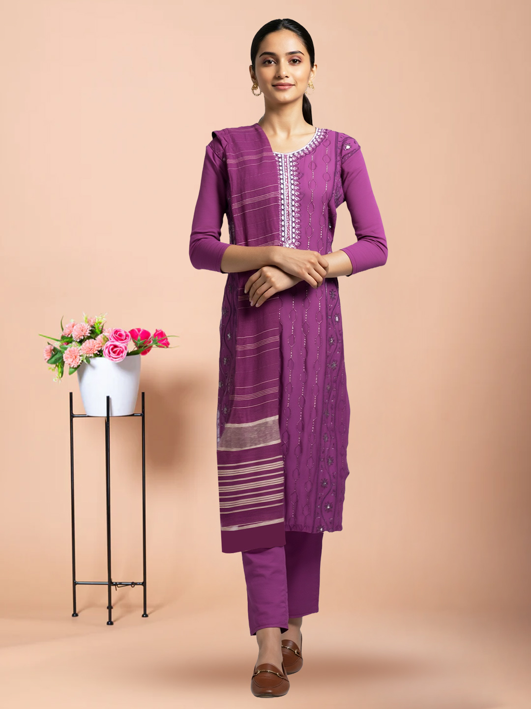 Step out gracefully in this round neck salwar suit adorned with delicate embroidery. Its soft, high-quality fabric and traditional dupatta make it an ideal choice for family gatherings or festive occasions.