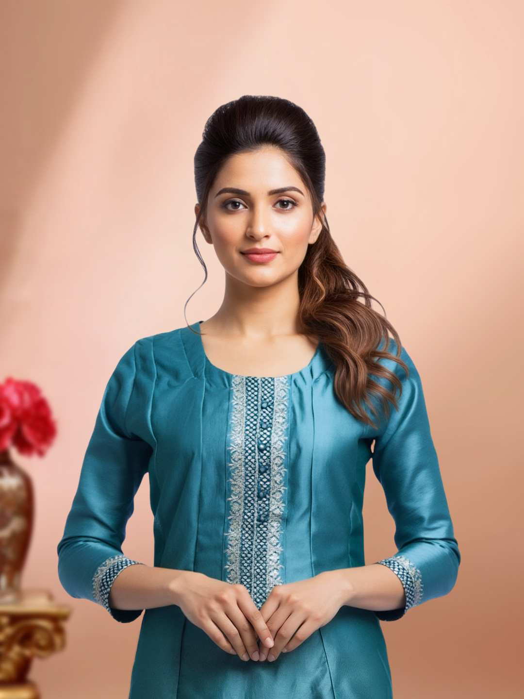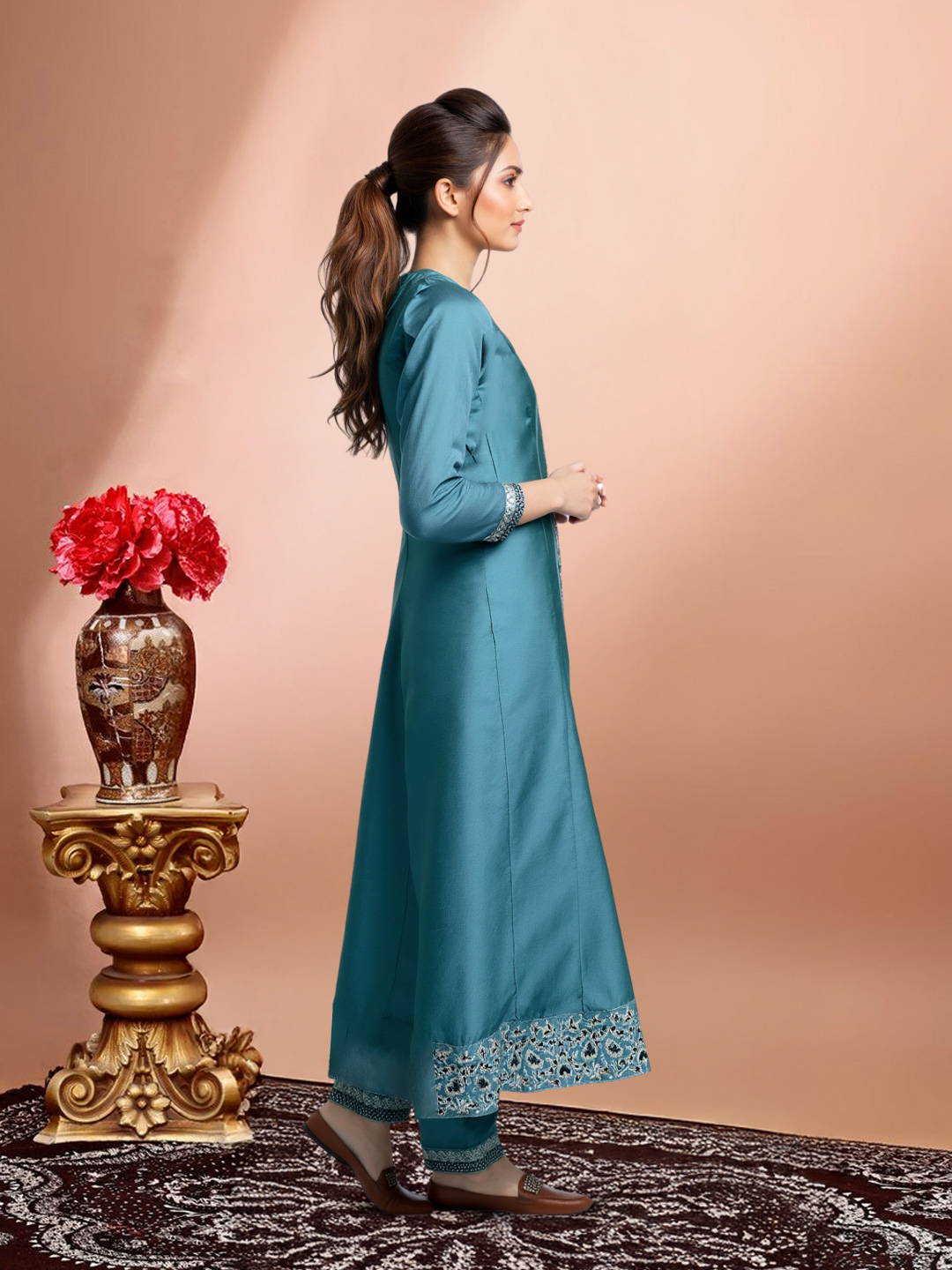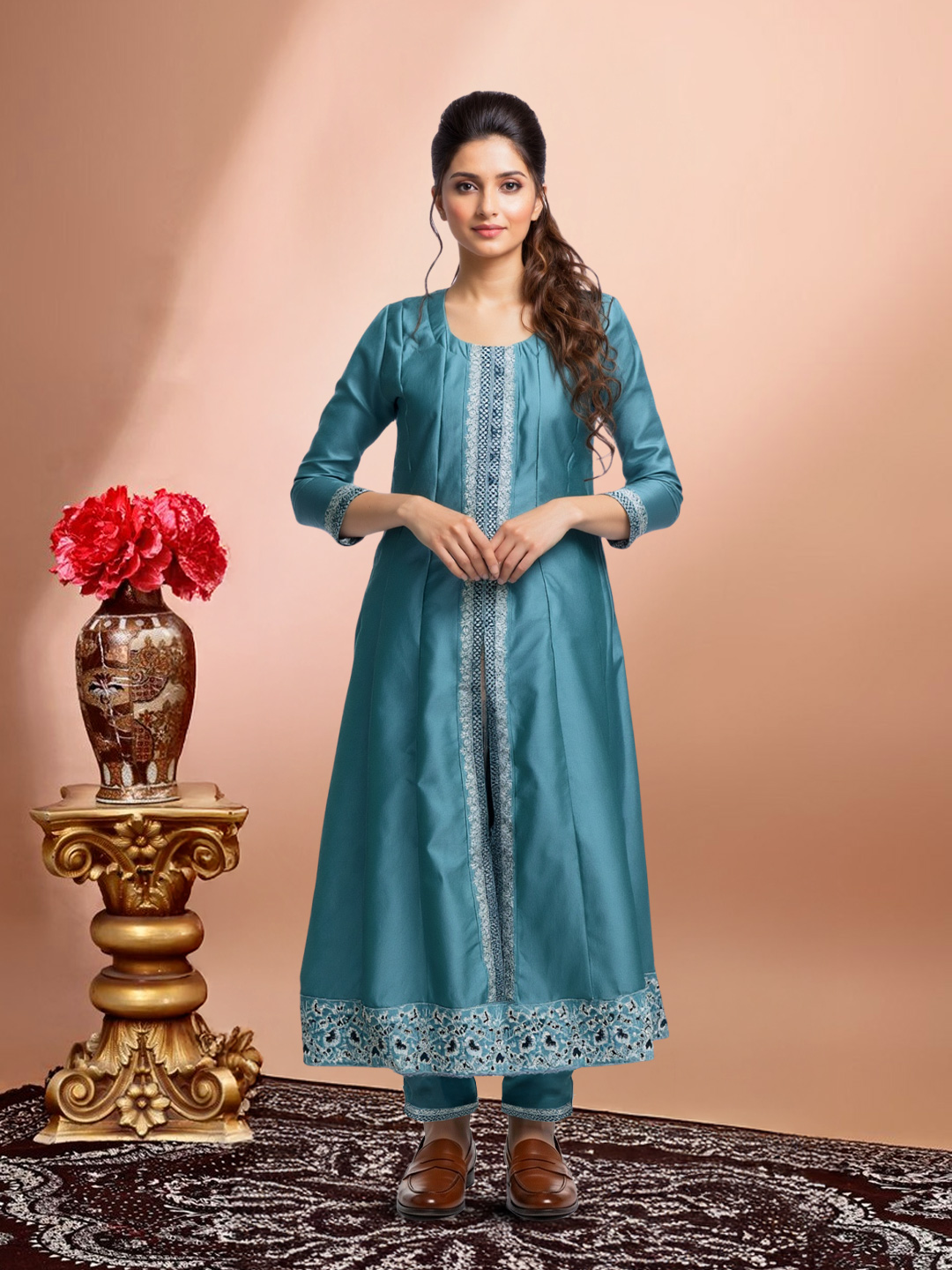 Coordinated pants with embroidered hems complete the polished look. The matching bottoms tie the ensemble together, creating a seamless and stylish ethnic outfit.