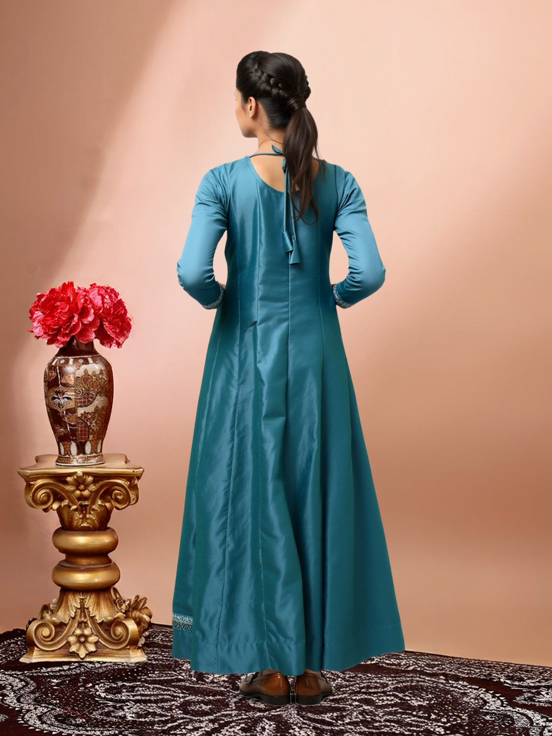 The softly flared Anarkali cut ensures elegant movement while offering a flattering fit for all body types. It combines comfort with a majestic, celebratory style perfect for festive occasions.