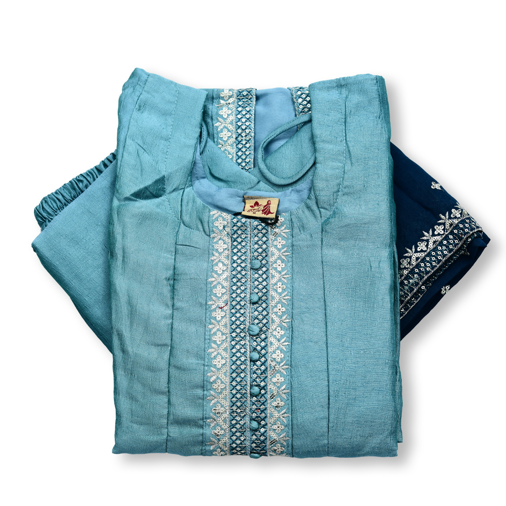 Crafted from a luxurious silk-blend fabric, the outfit boasts a soft sheen and smooth texture. The elegant back tie-up adds a contemporary touch while ensuring comfort and ease of wear.