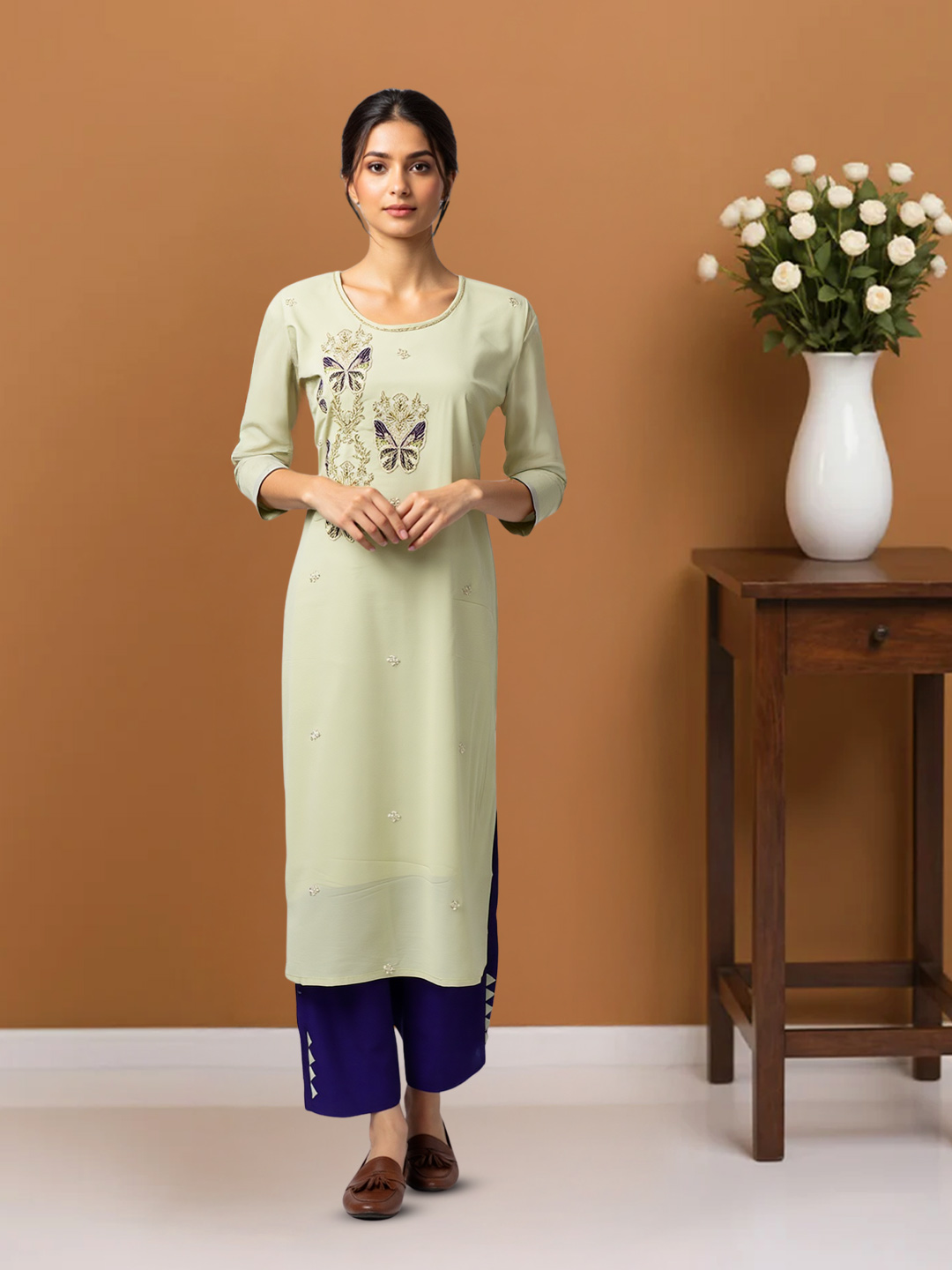 Whether you're attending a wedding, a festival, or a family gathering, this elegant butterfly embroidered salwar kameez set is a must-have addition to your wardrobe. The soothing color combination of beige and purple offers versatility, making it easy to pair with different accessories for a personalized touch.