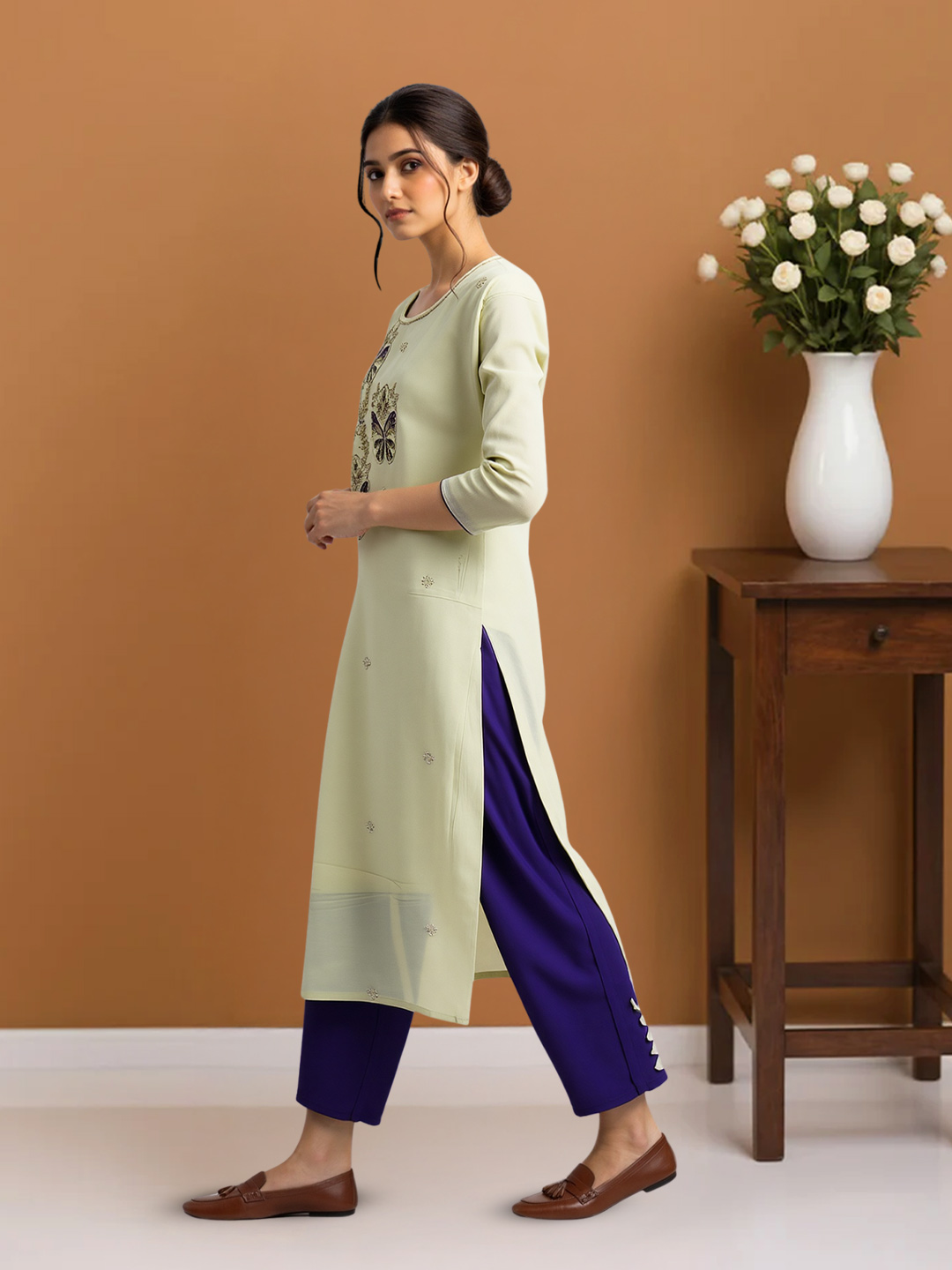 The deep purple salwar is both flattering and comfortable, with its crisp pleats and stylish cutwork on the hem. The modern design of the salwar gives the outfit a trendy twist while maintaining its traditional essence.