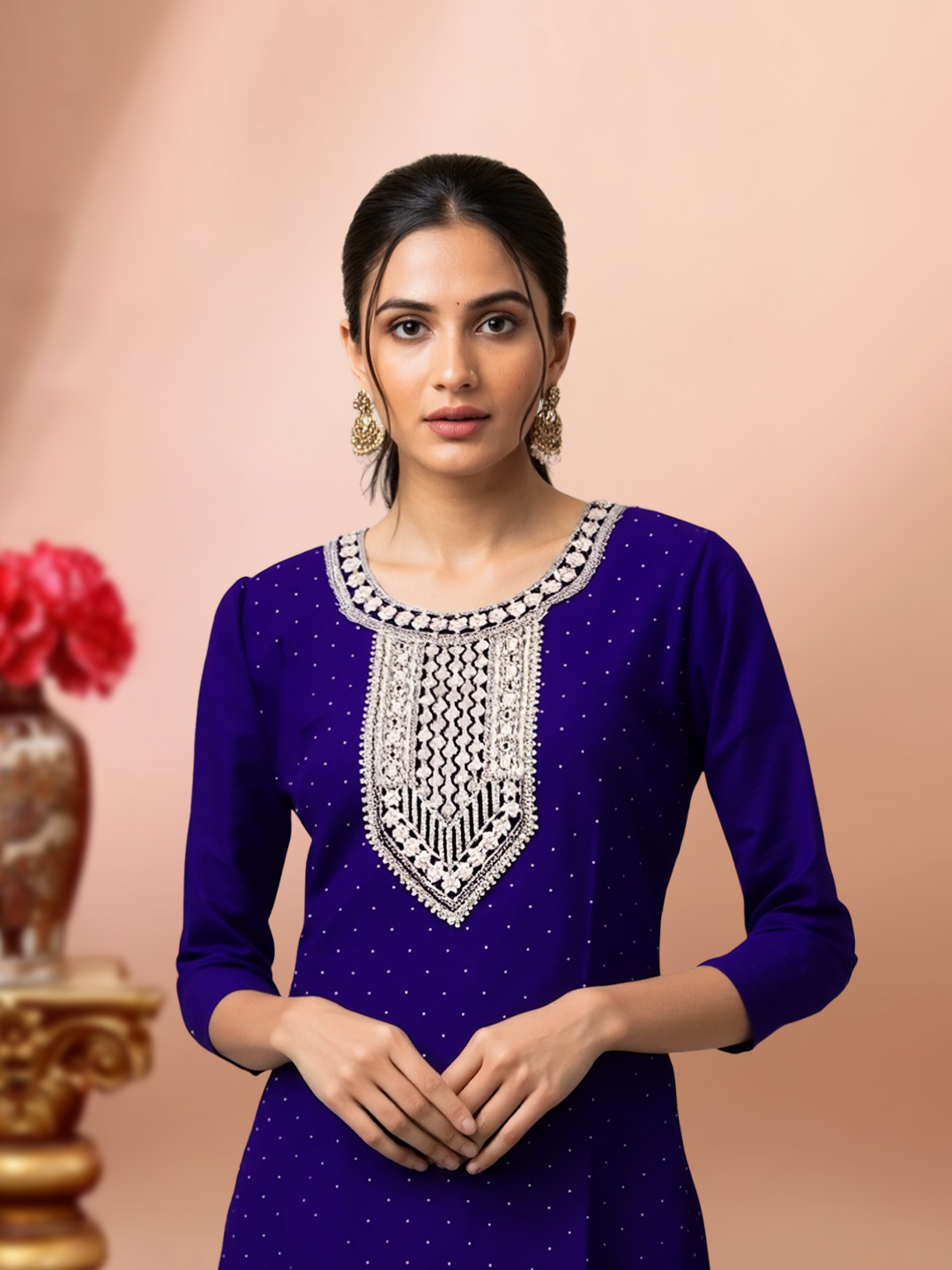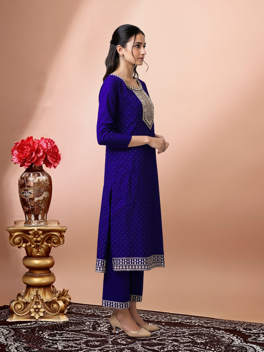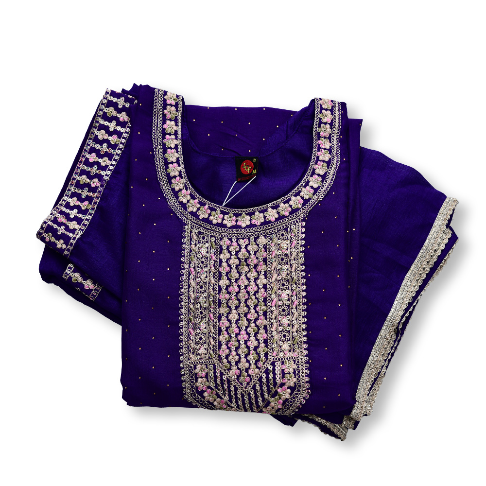The rich purple hue of the kameez exudes royalty and elegance. The intricate embellishments along the chest, made with metallic threadwork and delicate beads, add a touch of glamour and refinement. The subtle yet sophisticated embroidery on the salwar and dupatta's edges creates a harmonious and complete look.