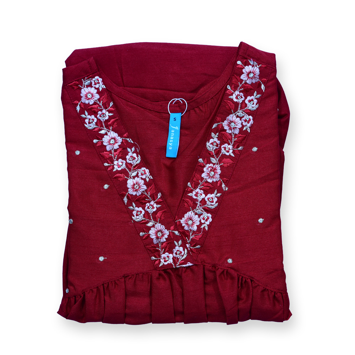 This kurta blends sophistication and comfort, featuring a V-shaped neckline enriched with pearl and floral embellishments. The signature Aliya cut with its loose, flowy pleats creates a flattering silhouette perfect for women who value style with ease.