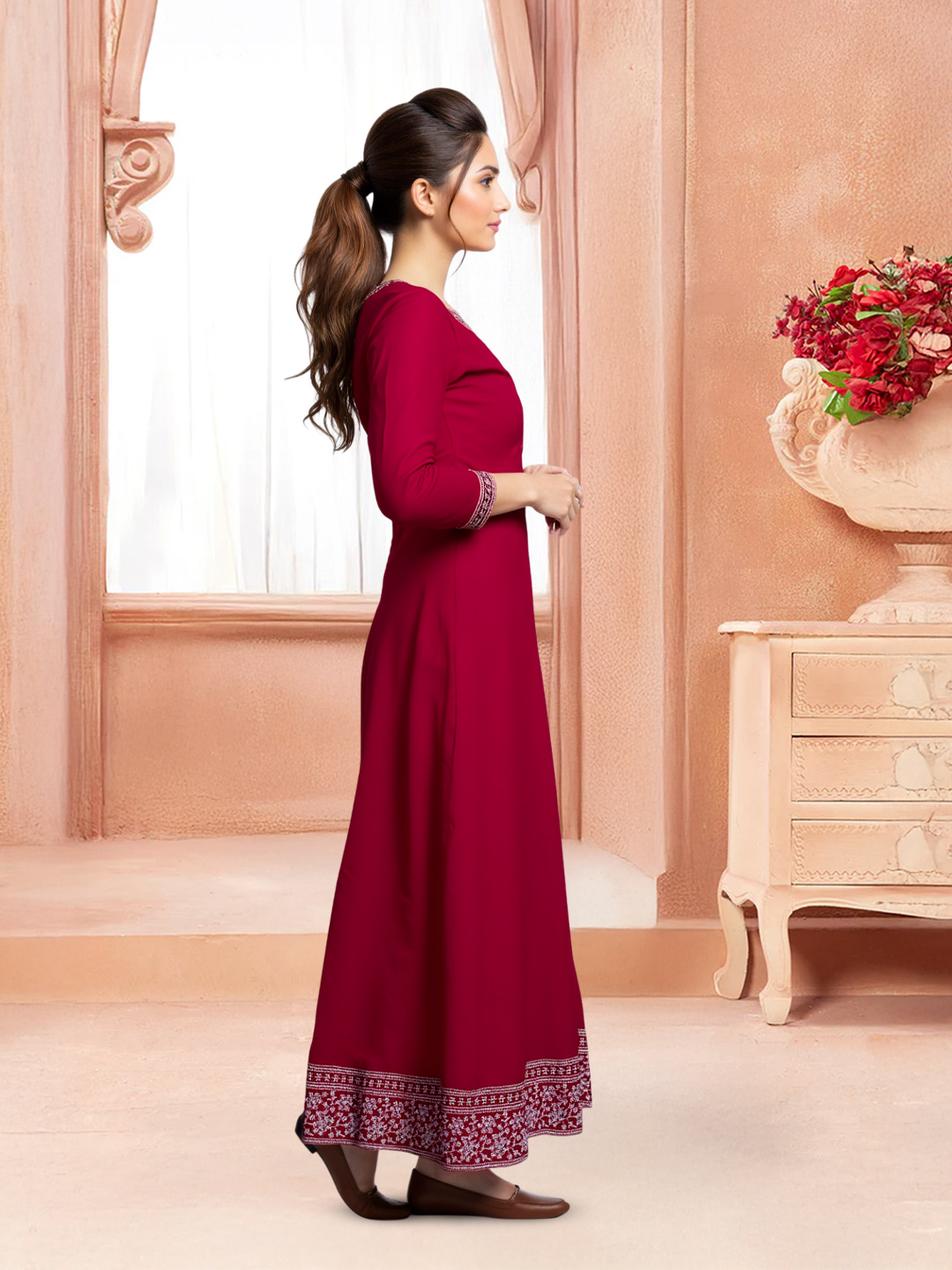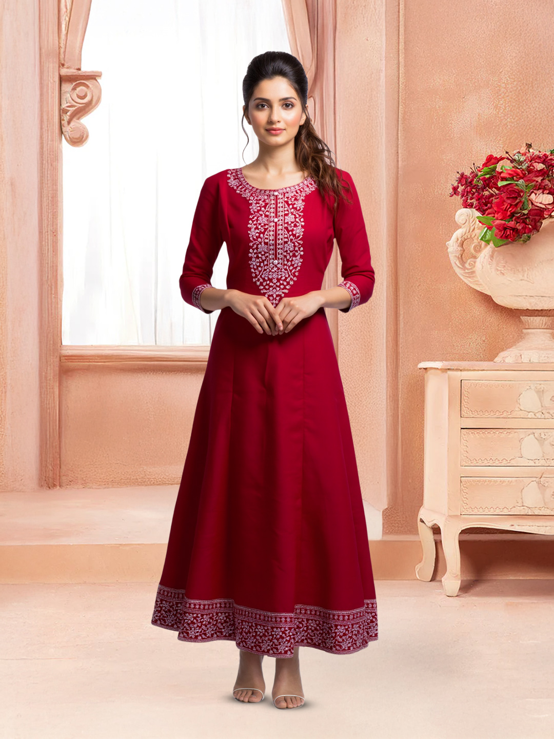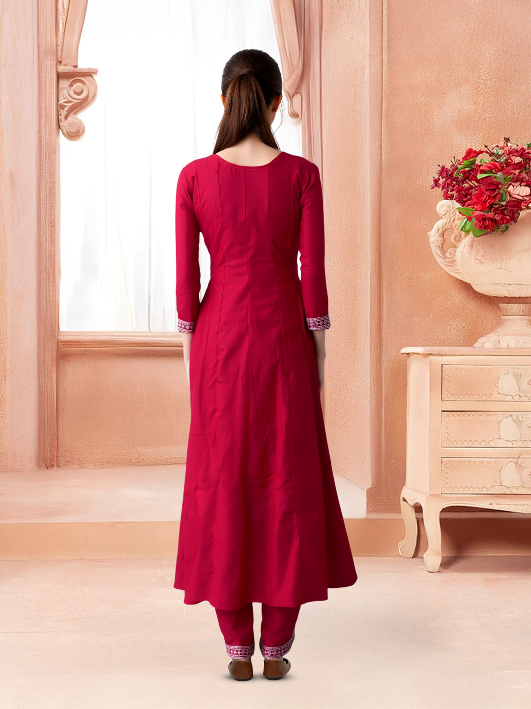 Designed with a standard fit and a gentle flare at the hem, the Anarkali kurta allows effortless movement while enhancing feminine elegance.