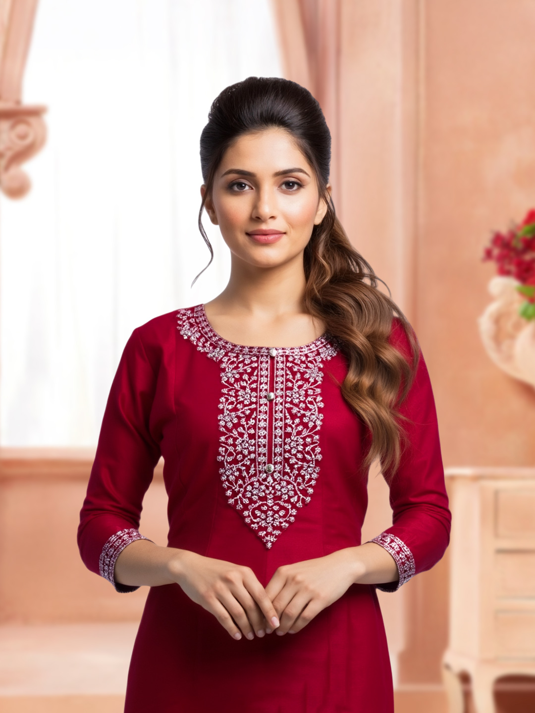 Delicate embroidery adorns the neckline and chest area, highlighting fine craftsmanship while adding depth and charm to the overall design.