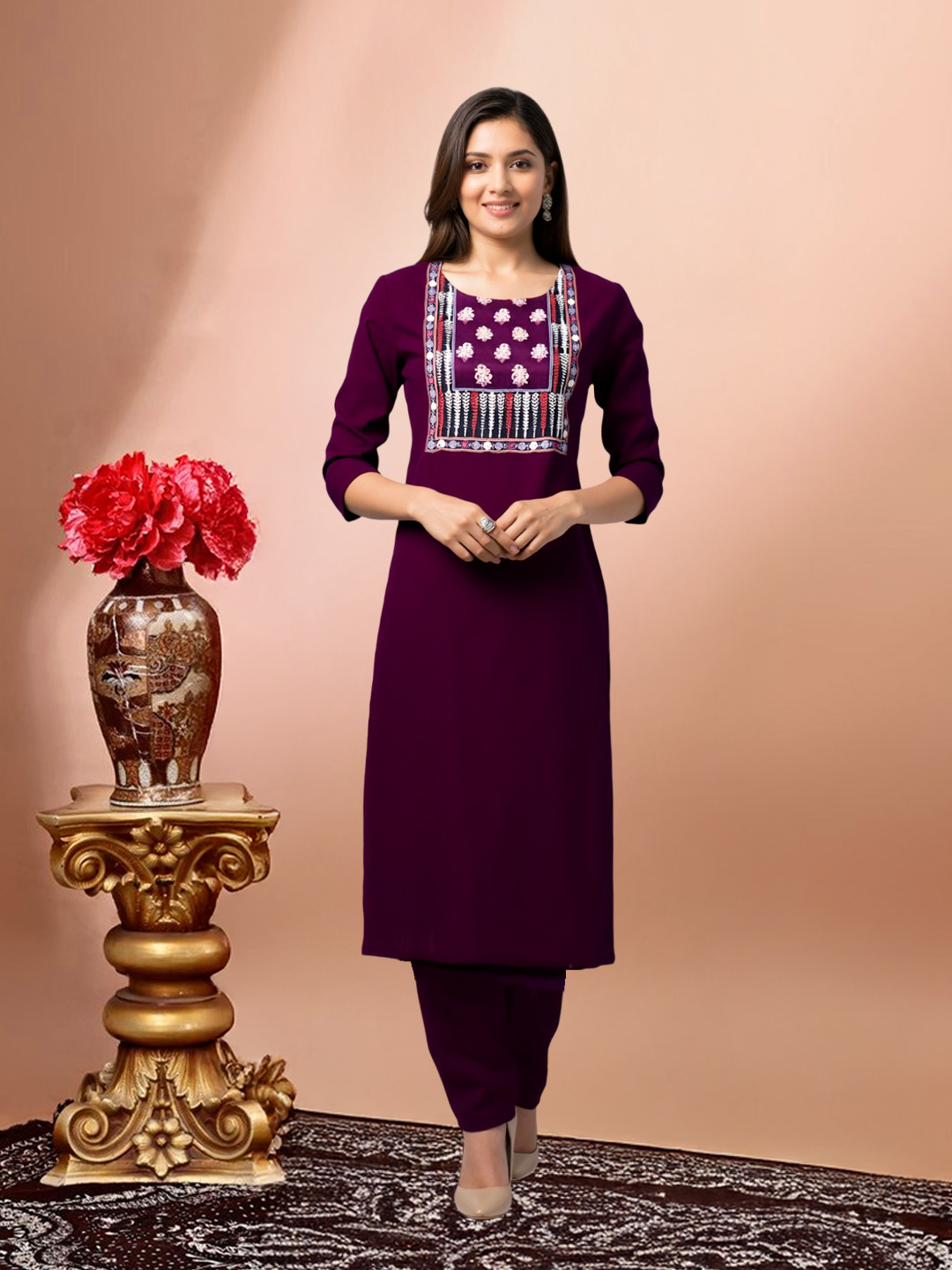 Bring charm to any occasion with this embroidered kurta set. The straight-fit kurta, balanced 3/4th sleeves, and soft fabric ensure a flattering look while keeping you comfortable and confident.