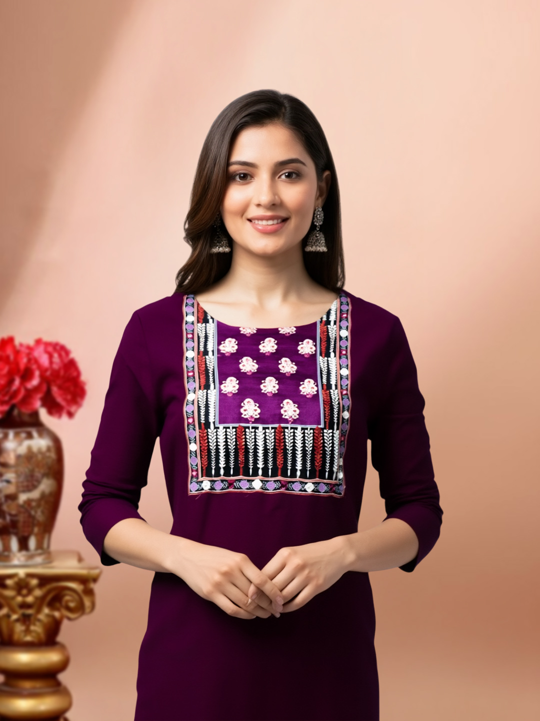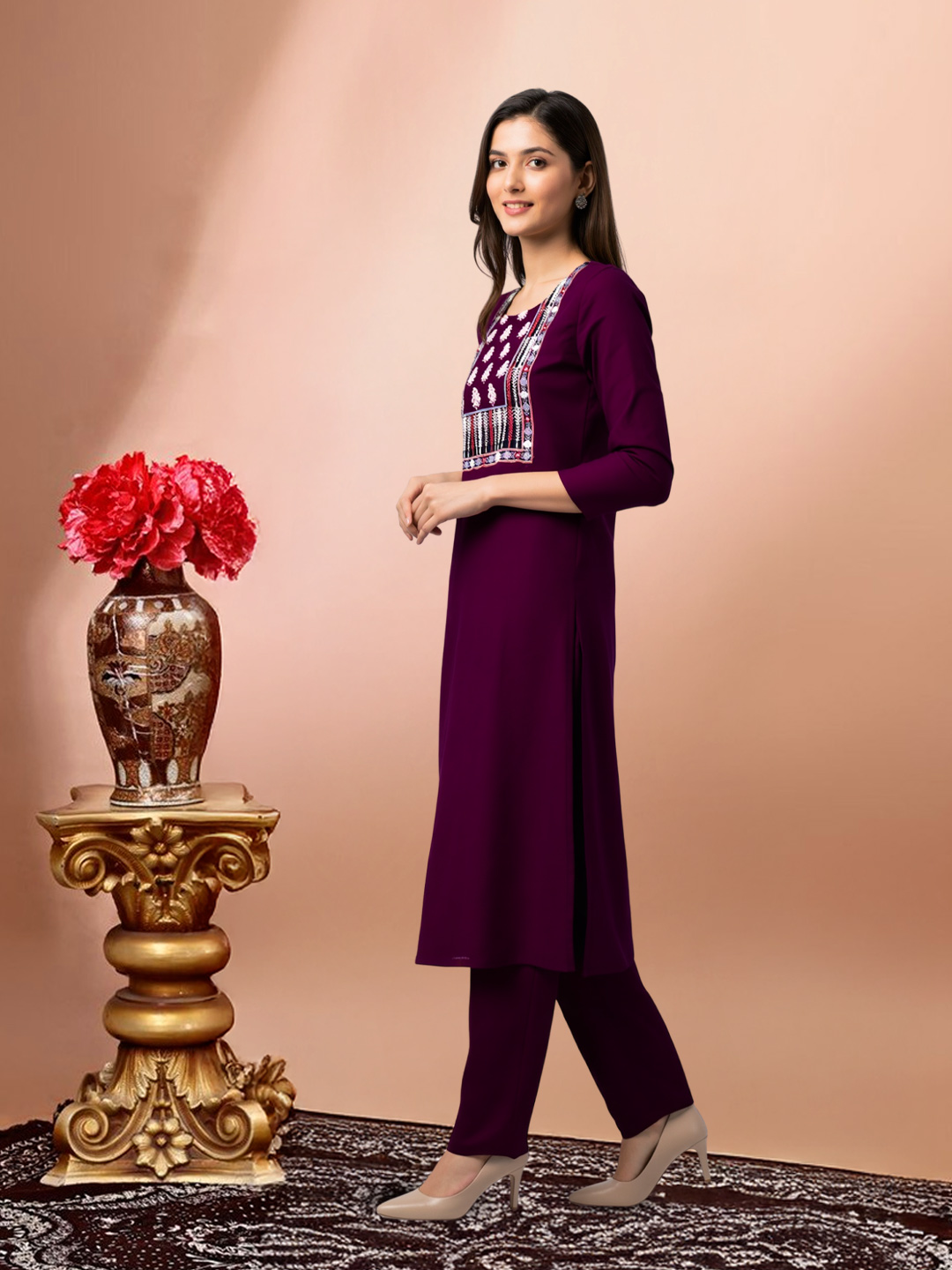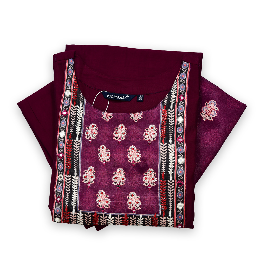 This ethnic kurta set combines traditional aesthetics with modern ease. With its embroidered details, coordinated pants, and flowing dupatta, the set offers a polished, feminine look while keeping comfort at the forefront.