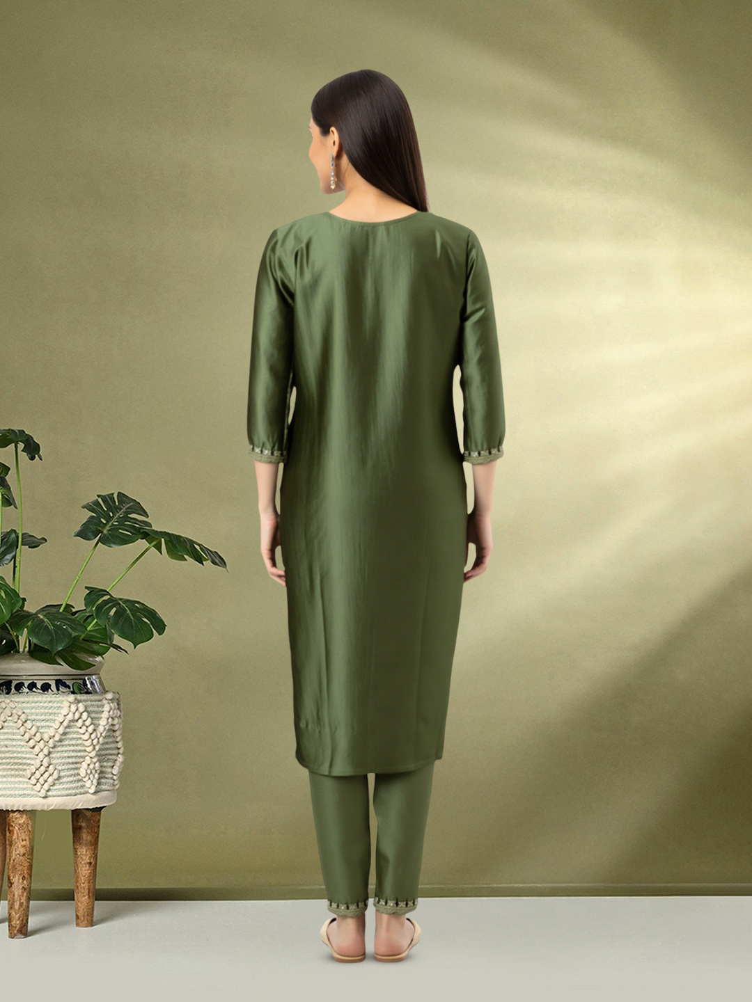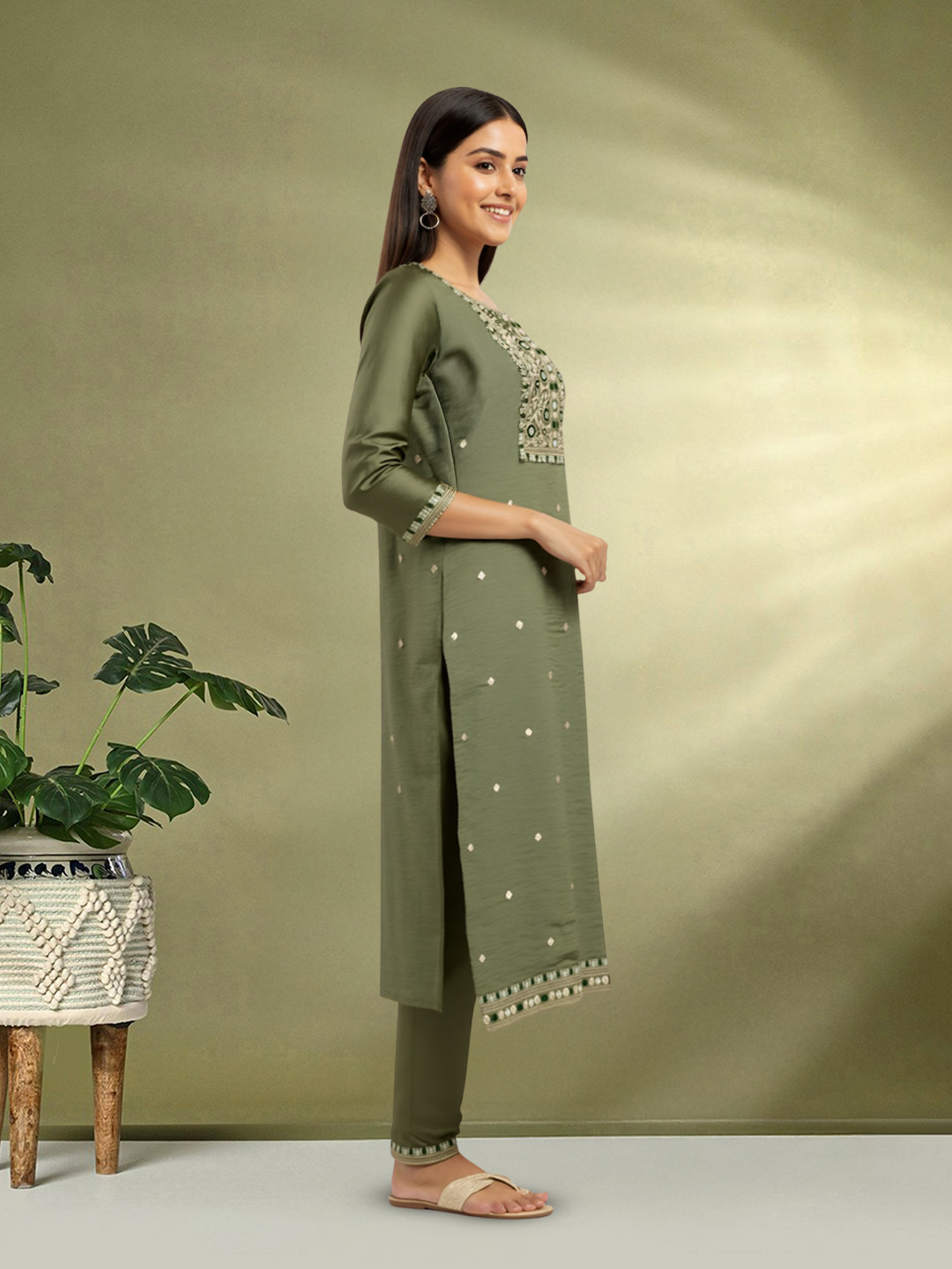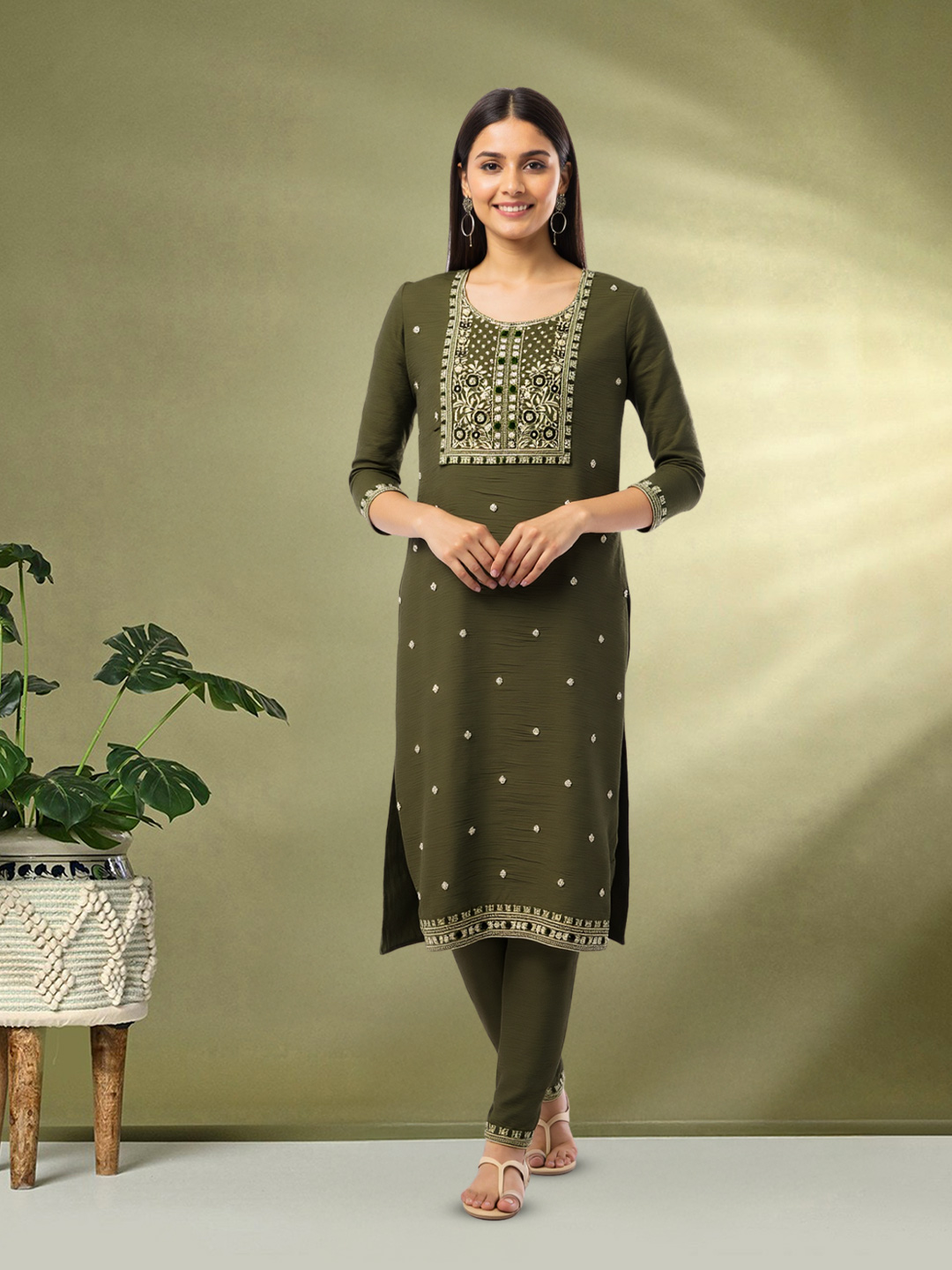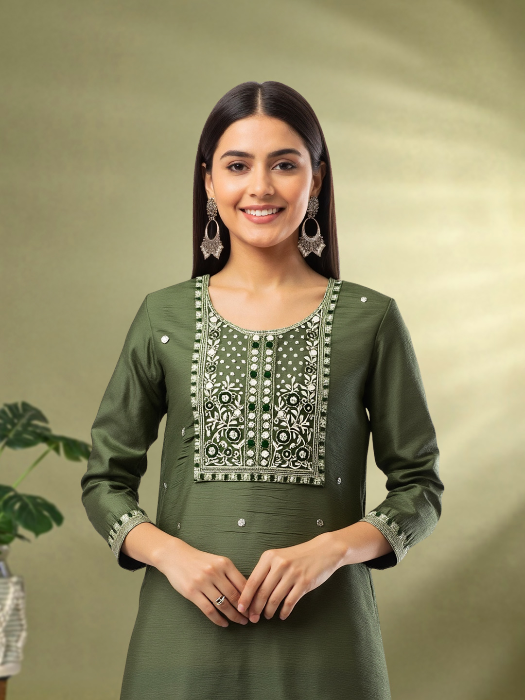 This kurta set blends timeless elegance with modern comfort. Featuring a round neck, 3/4 sleeves, and embroidery on premium-quality fabric, it offers a rich, stylish look. The lightweight dupatta and matching pant complete the ensemble with charm and ease.