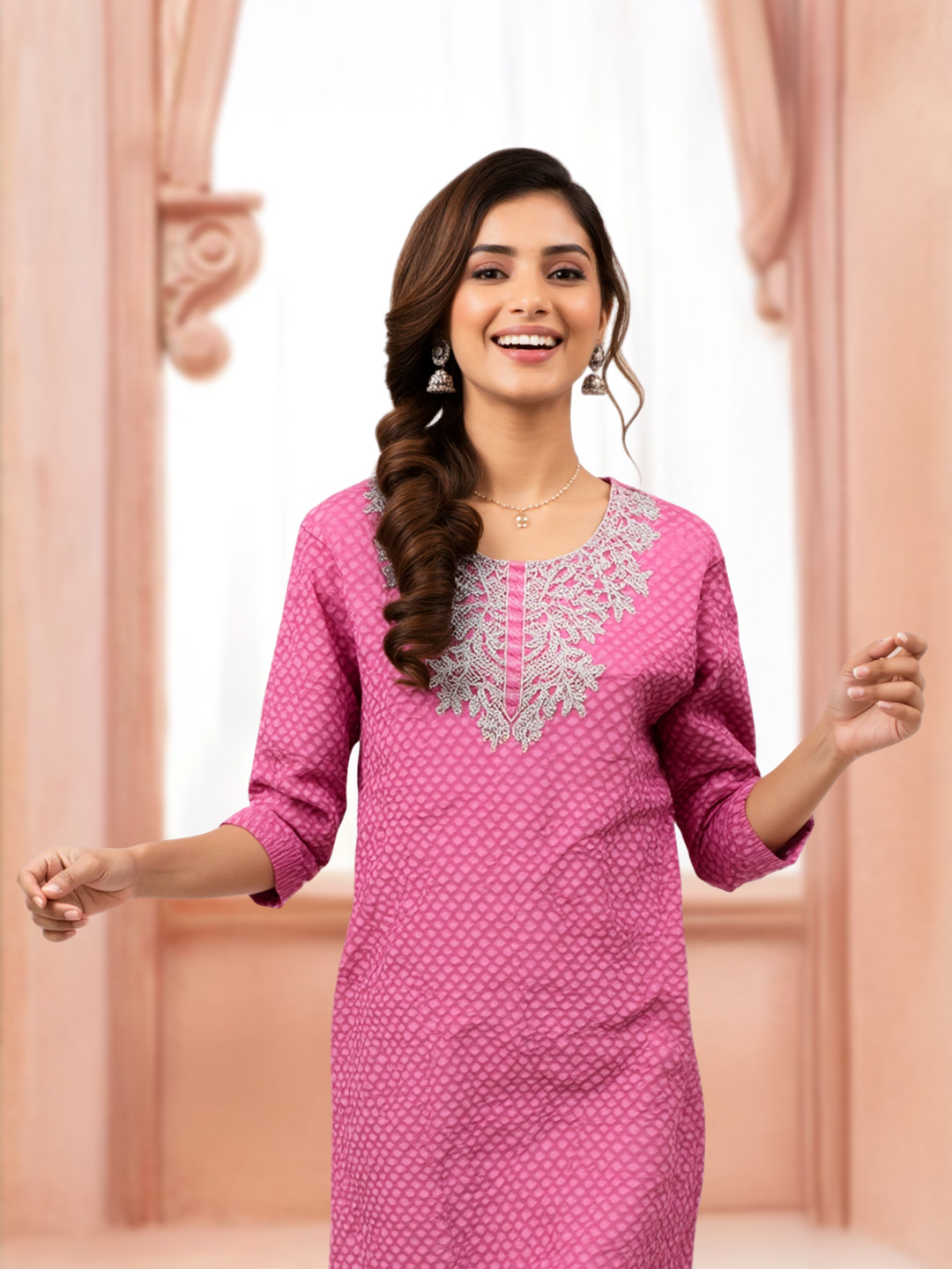 Designed for the modern woman, this kurta offers a classic straight cut and elegant embroidery around the round neck. The premium-quality fabric ensures all-day comfort without compromising on style.