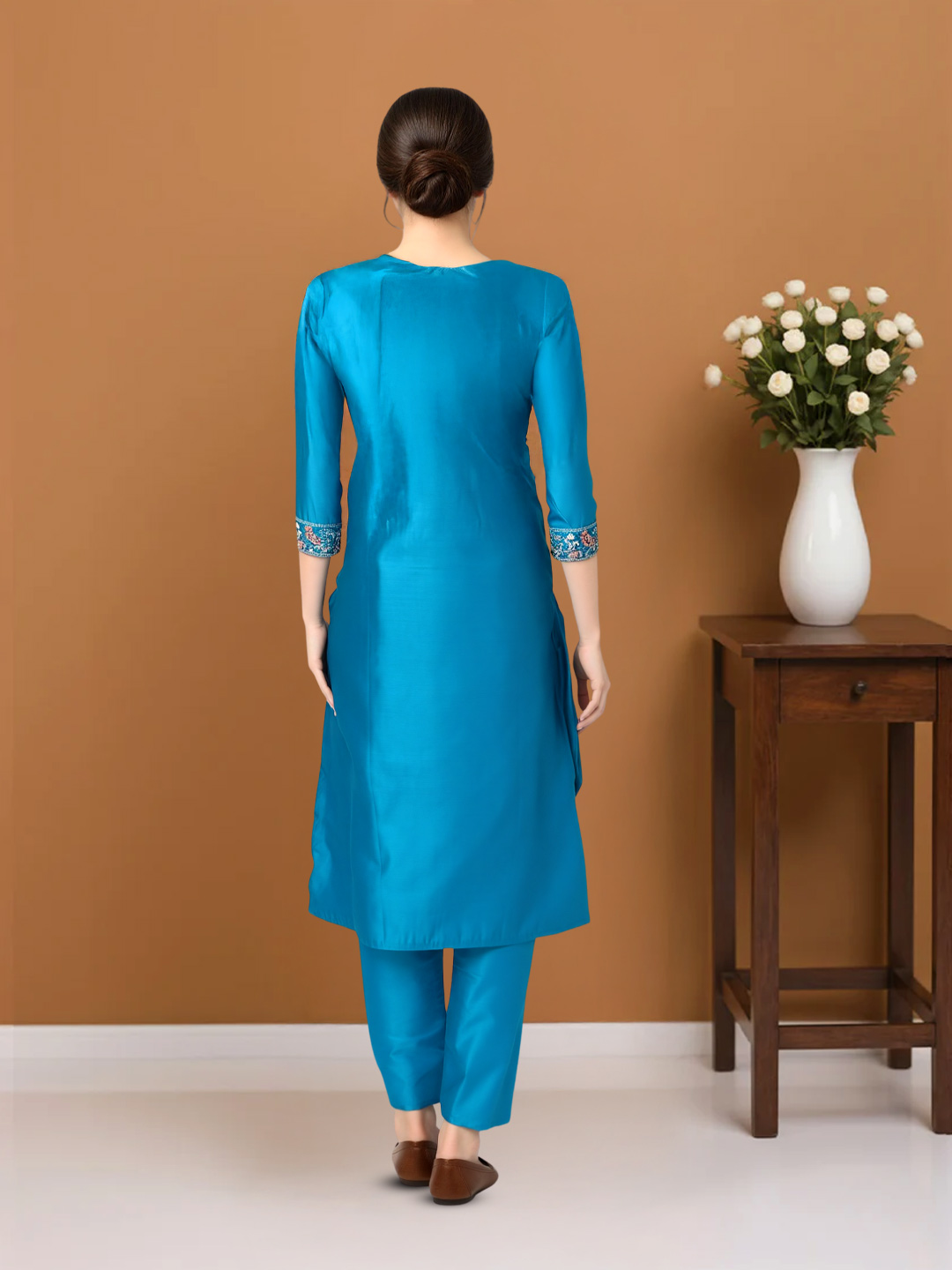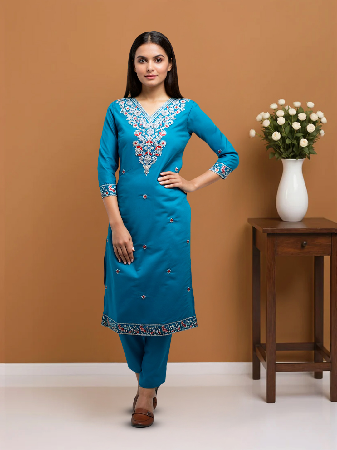 Exquisite and timeless, the Elegant Embroidery Ethnic Kurta with Pant & Floral Dupatta Set is designed to make a statement. The intricate gold and rich-colored embroidery adorning the neckline and sleeves elevates the outfit to a luxurious level. The soft, airy floral dupatta, paired with a solid blue kurta, offers a beautiful contrast, adding a delicate touch of freshness. The traditional salwar ensures comfort without compromising on style, making this set ideal for formal gatherings, weddings, or cultural celebrations.