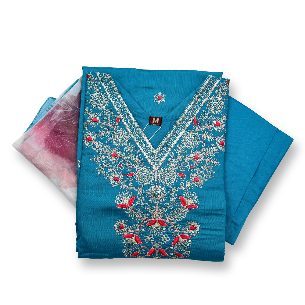 This Elegant Embroidery Ethnic Kurta with Pant & Floral Dupatta Set combines stunning craftsmanship with everyday comfort. Featuring intricate embroidery in shades of gold along the neckline and sleeves, the kurta radiates sophistication. The soft, light blue floral dupatta complements the solid blue kurta with its airy, artistic prints. Paired with traditional salwar pants, this set offers both comfort and classic style—perfect for formal occasions and festive celebrations.