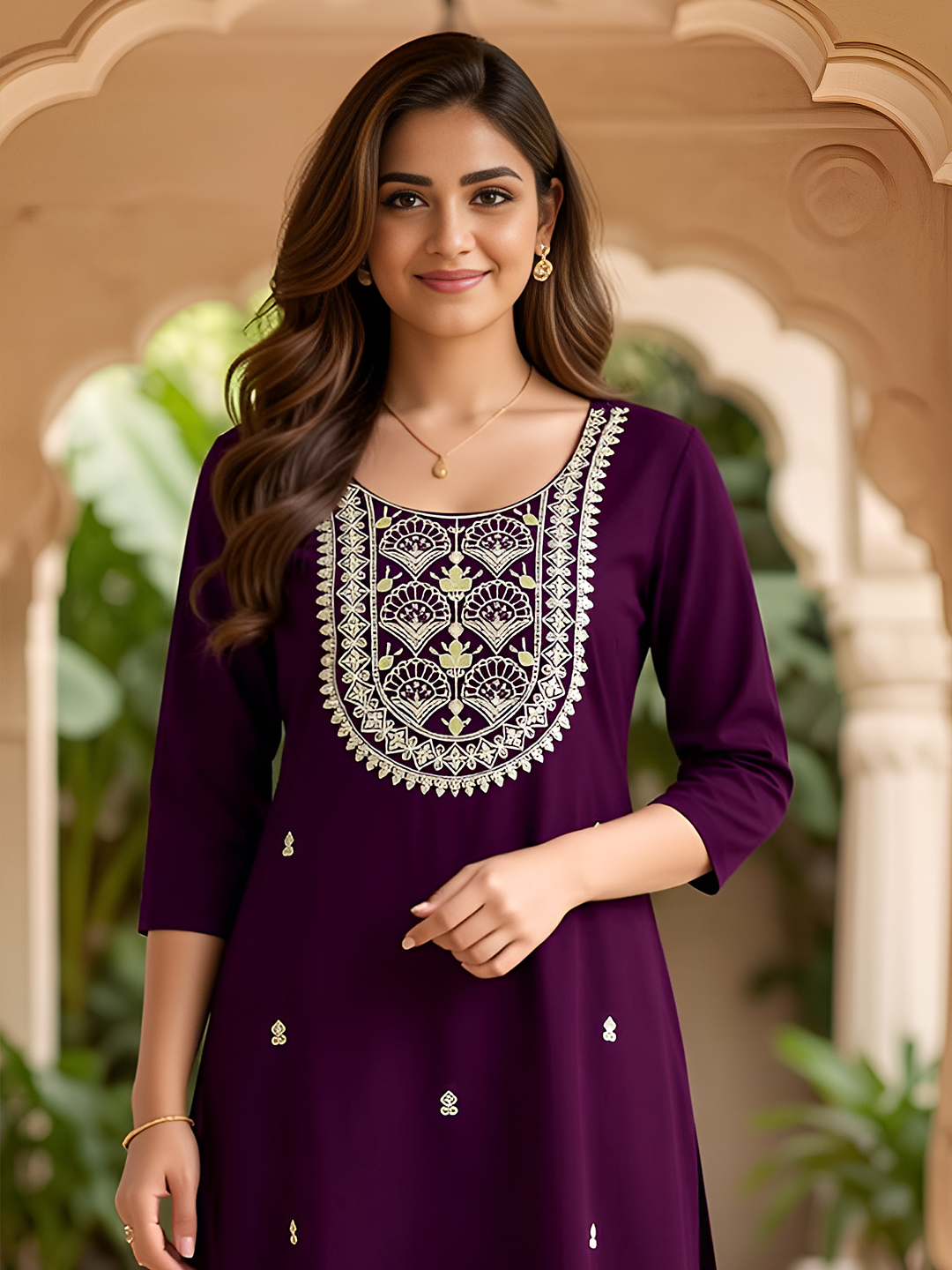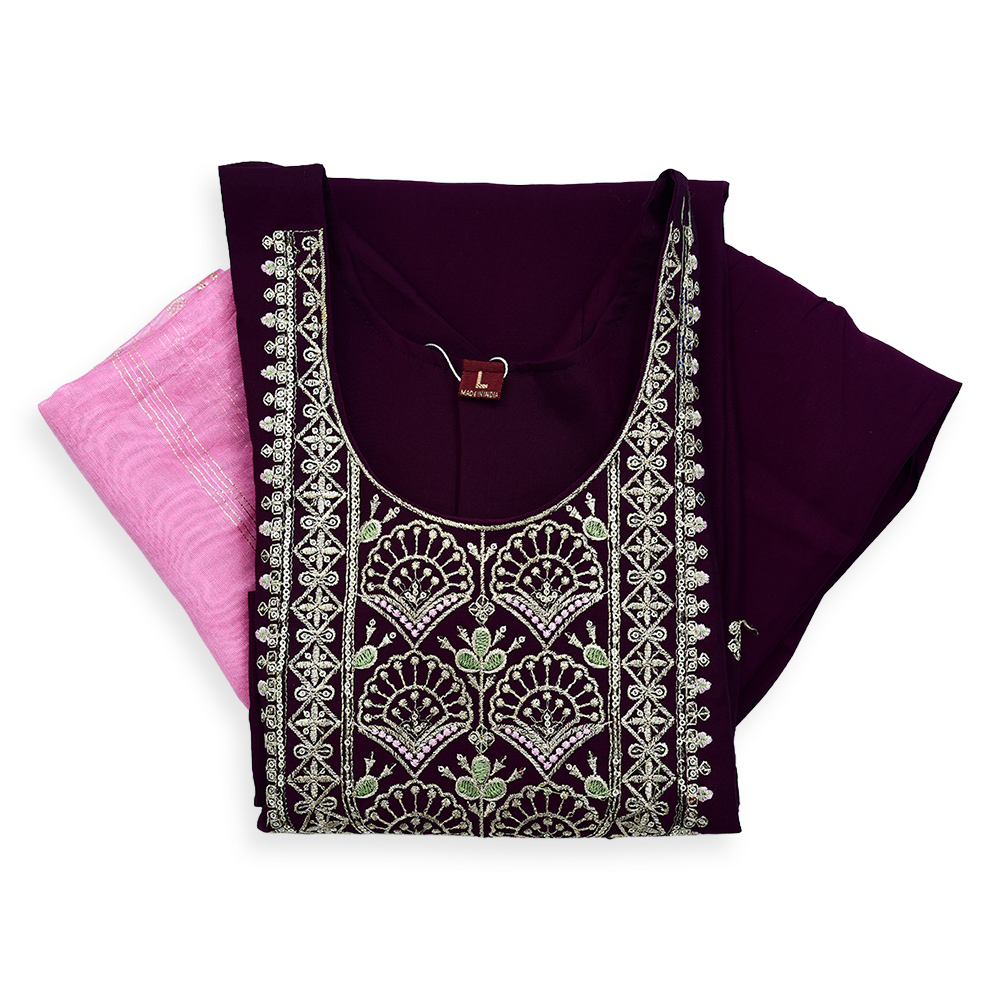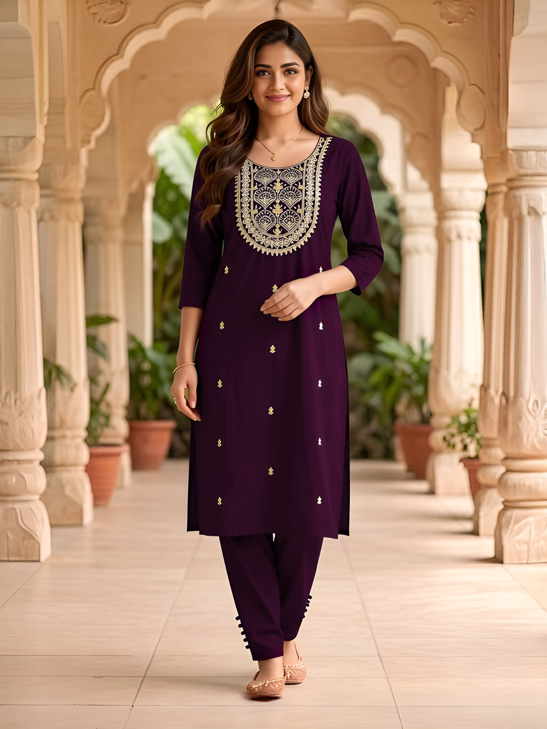 Designed to keep you stylish without compromising on comfort, this salwar suit set is a wardrobe essential. The 3/4 sleeves and breathable fabric make it perfect for all-day wear, while the detailed embroidery adds just the right amount of elegance. Dress it up or down for any occasion with ease.