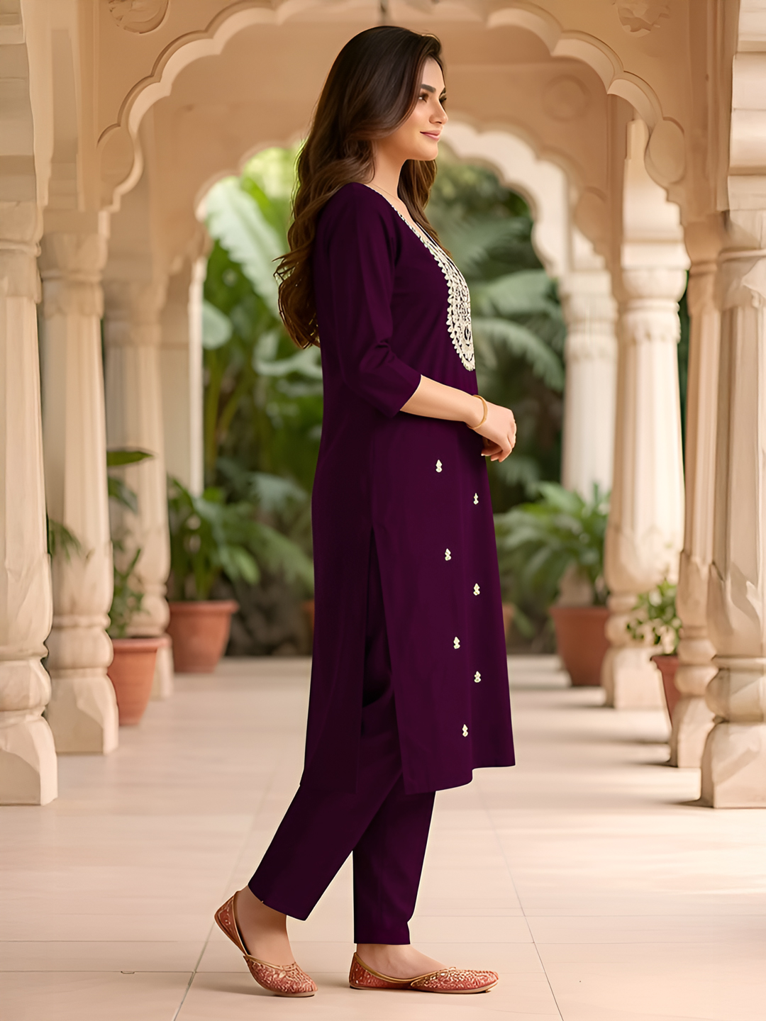 Redefine grace with this straight-cut salwar suit set, designed for modern women who appreciate classic charm. The intricately embroidered neckline adds a refined touch, while the soft, breathable fabric ensures all-day comfort. Paired with matching pants and a lightweight dupatta, this outfit is perfect for festive celebrations, casual outings, or traditional gatherings.