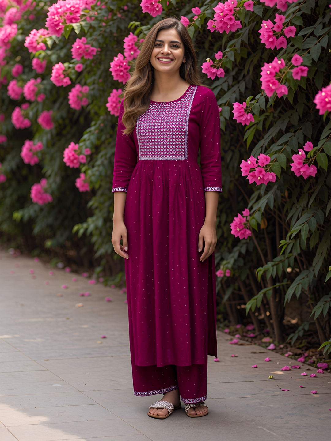 Elevate your everyday ethnic style with this beautifully designed straight-cut salwar suit set. Featuring intricate embroidery on the front yoke with subtle sequinned accents, this outfit brings a refined traditional charm. The soft, breathable fabric ensures lasting comfort, while the relaxed fit allows easy movement. Paired with matching bottoms and finished with delicate dotted detailing, it’s perfect for both casual outings and festive moments.