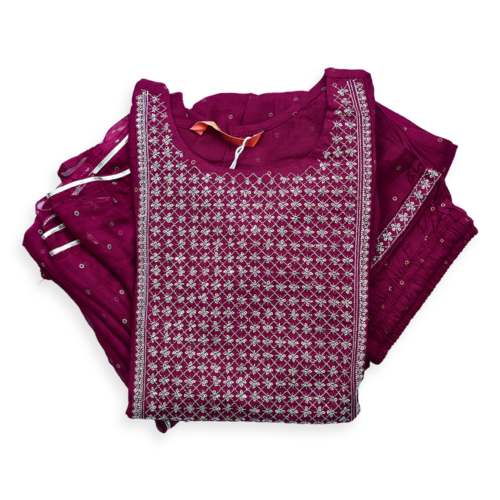 Bring home a perfect blend of comfort and elegance with this embroidered salwar suit set. The three-quarter sleeves and straight-cut design offer a stylish yet practical look. Crafted from lightweight fabric, it feels soft against the skin, while the matching bottoms create a complete outfit. Ideal for festive days or simple occasions when you want to look effortlessly graceful.
