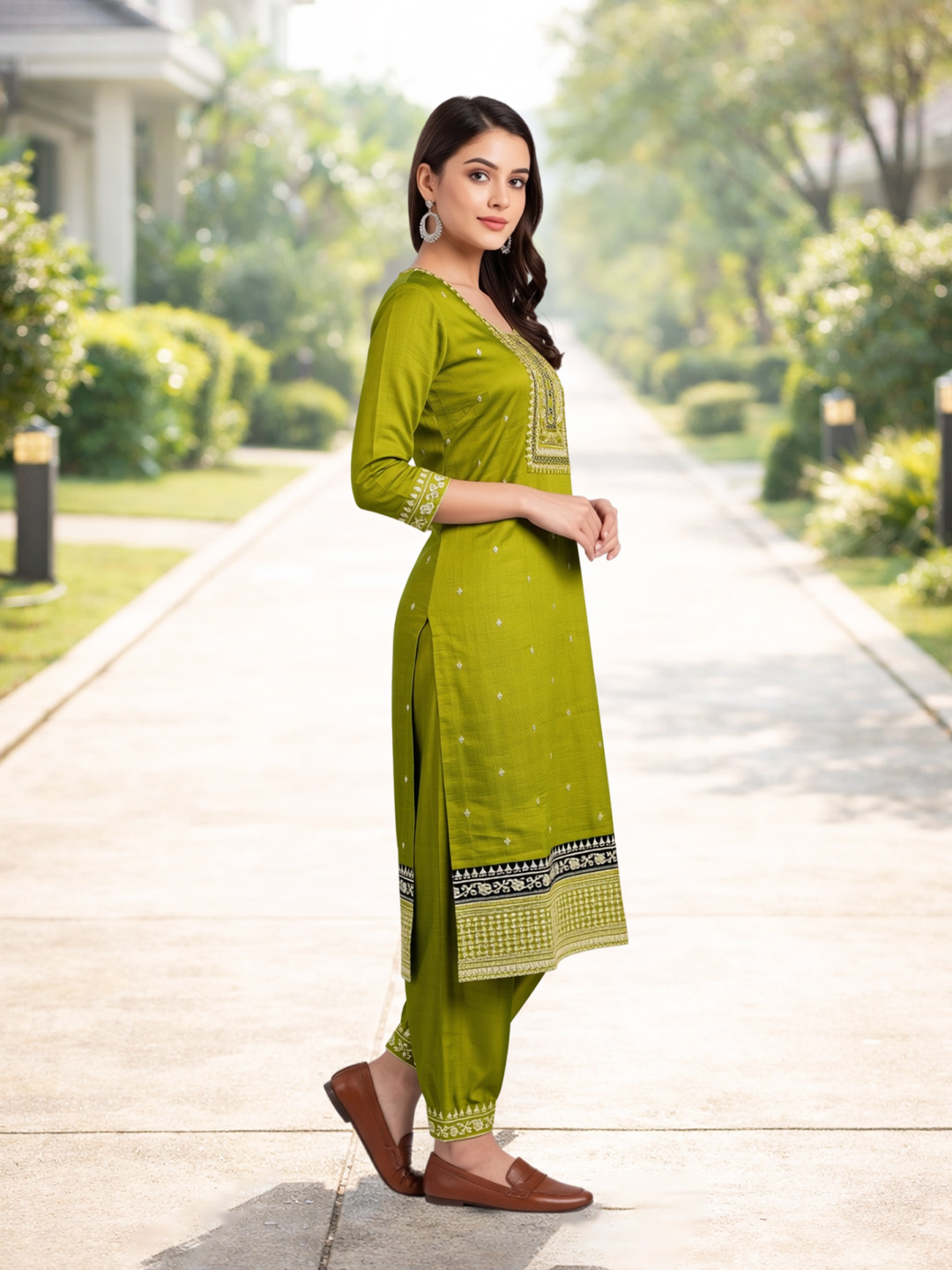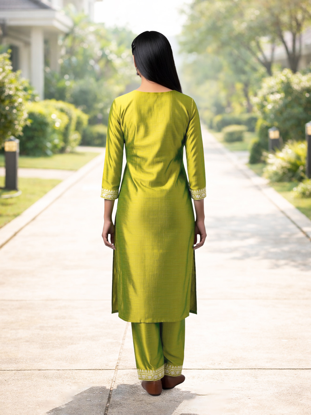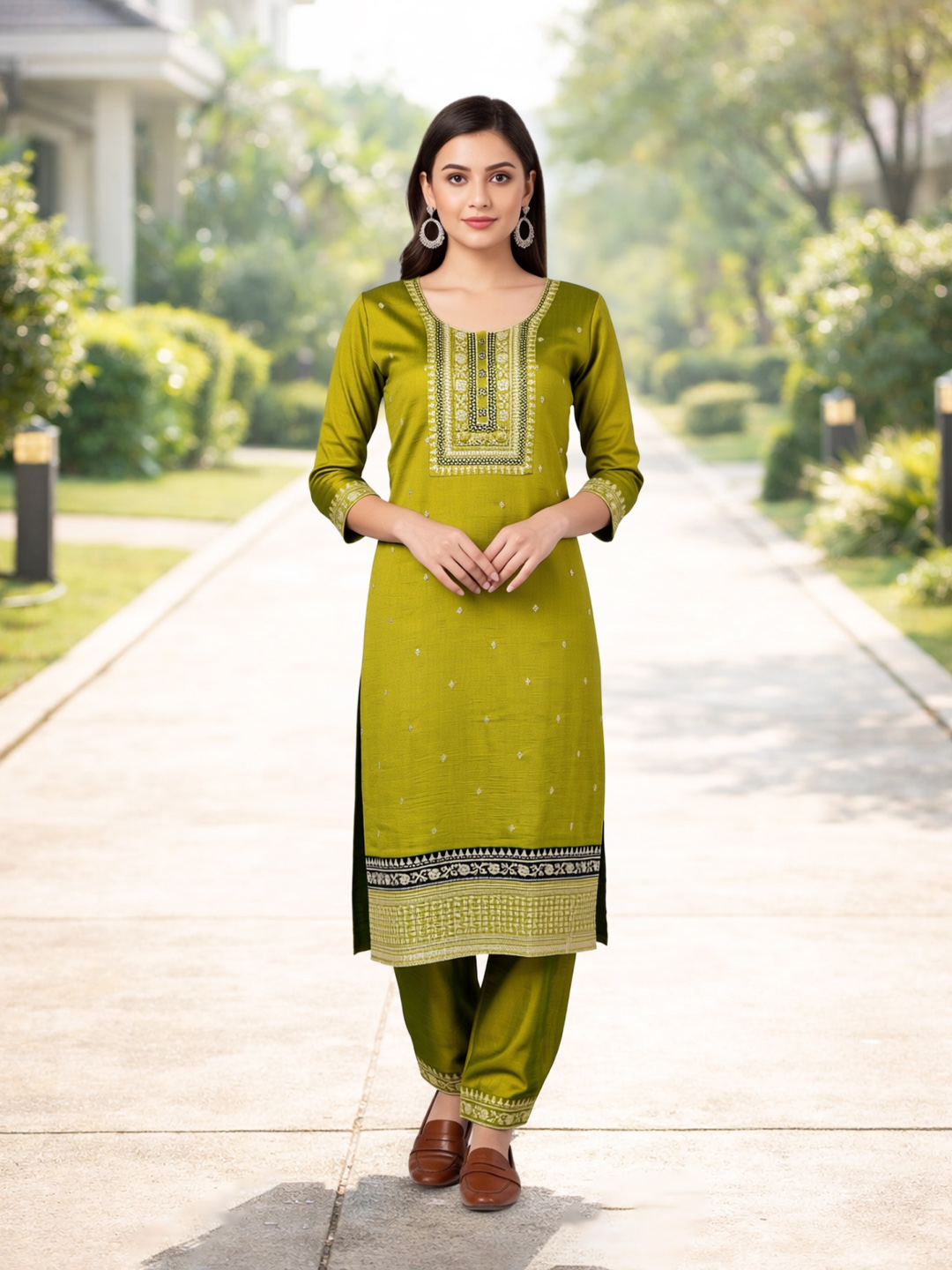 Designed with embroidered three-quarter sleeves, this suit combines modern styling with traditional aesthetics. The sleeve detailing adds depth to the design while ensuring ease of movement and comfort.