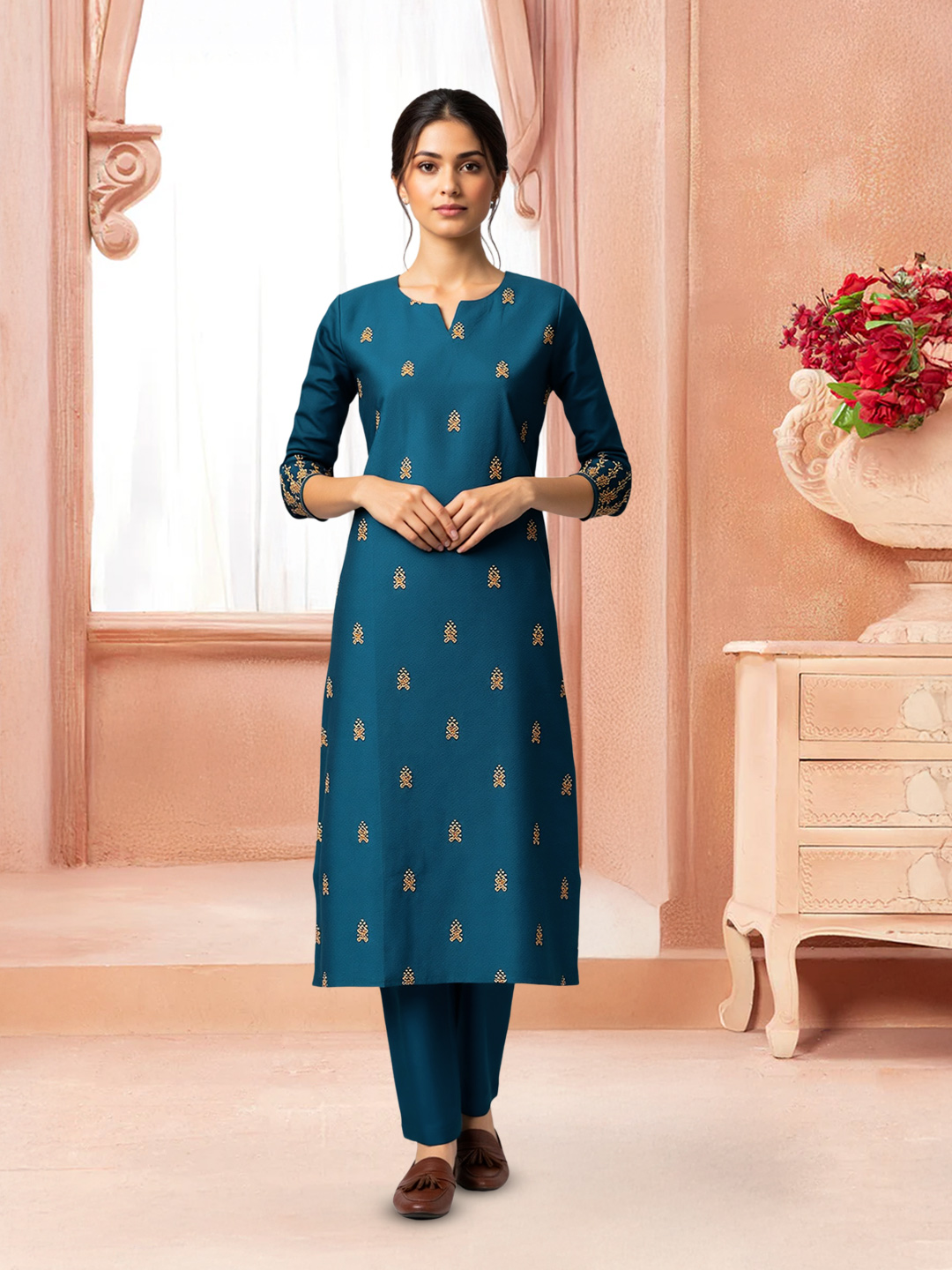 Celebrate ethnic charm with this elegant salwar suit set. Small floral motifs on the kurta, a subtle notched neckline, and intricate golden embroidery on the cuffs create a delicate, graceful look. Paired with matching straight-fit pants and a lightweight floral dupatta, this ensemble is perfect for festive or casual occasions alike.