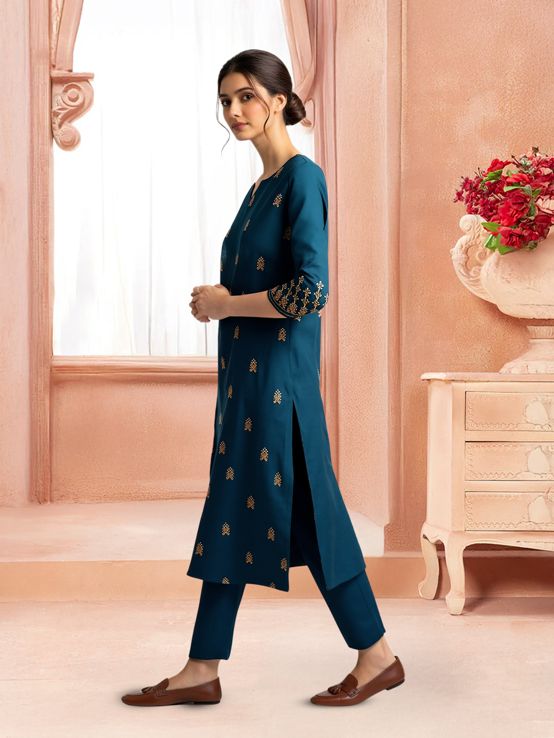 This salwar suit set brings together classic design and delicate detailing. The straight-cut kurta features a subtle notched neckline and small floral embroidery scattered across the front. Three-quarter sleeves with golden embroidered cuffs add refined sophistication, while the matching straight-fit pants and floral print dupatta complete the graceful look.
