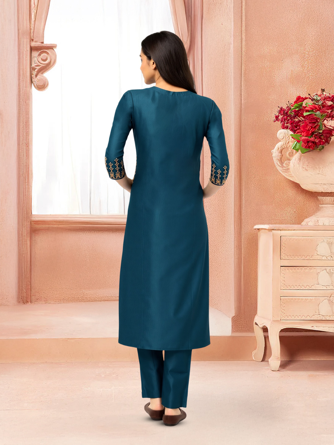 Designed for comfort and elegance, this salwar suit set combines a straight silhouette kurta with refined embroidery details. The notched neckline and golden embroidered cuffs enhance its appeal, while the matching straight-fit pants and soft floral print dupatta provide a balanced, sophisticated finish.