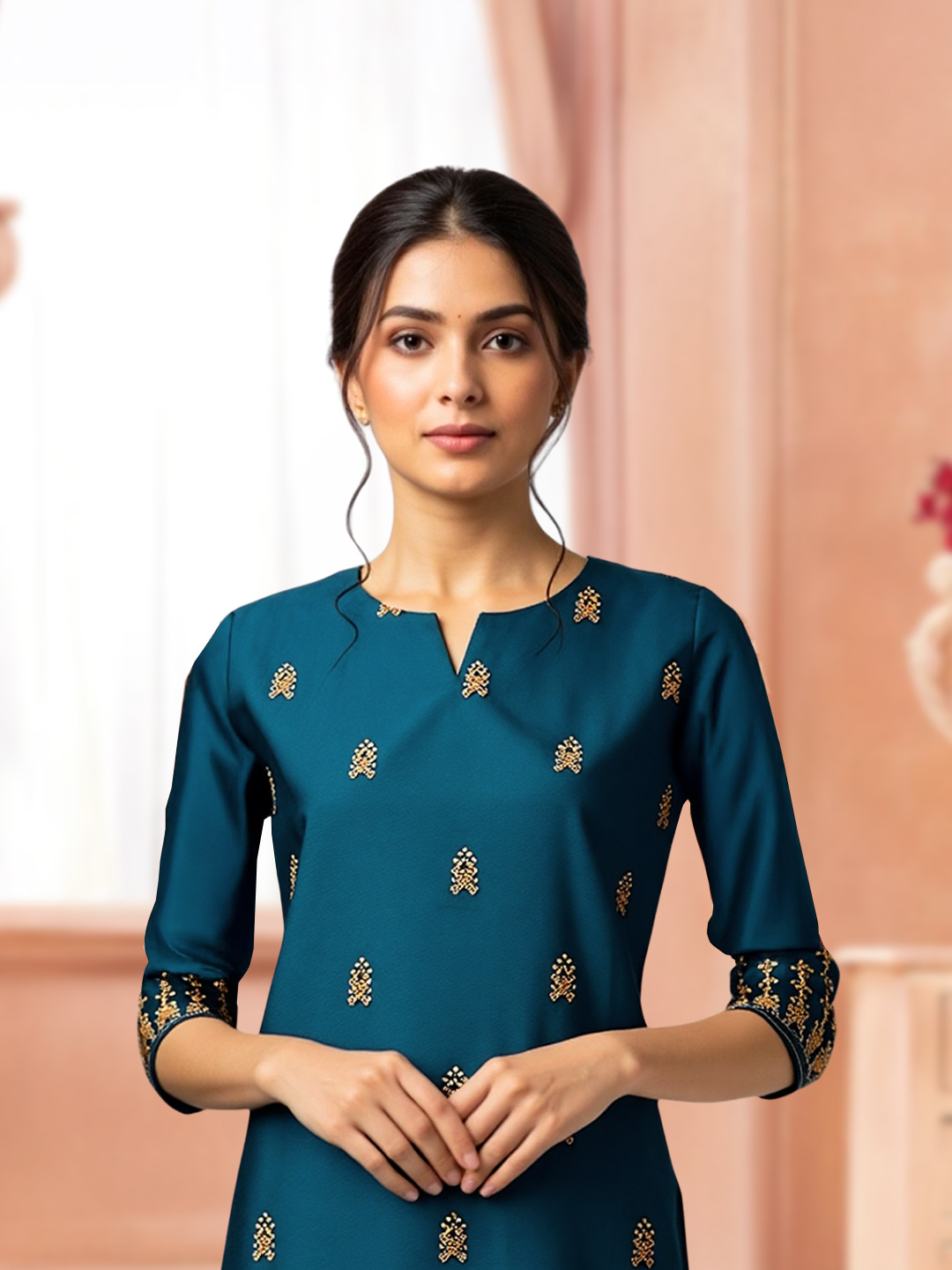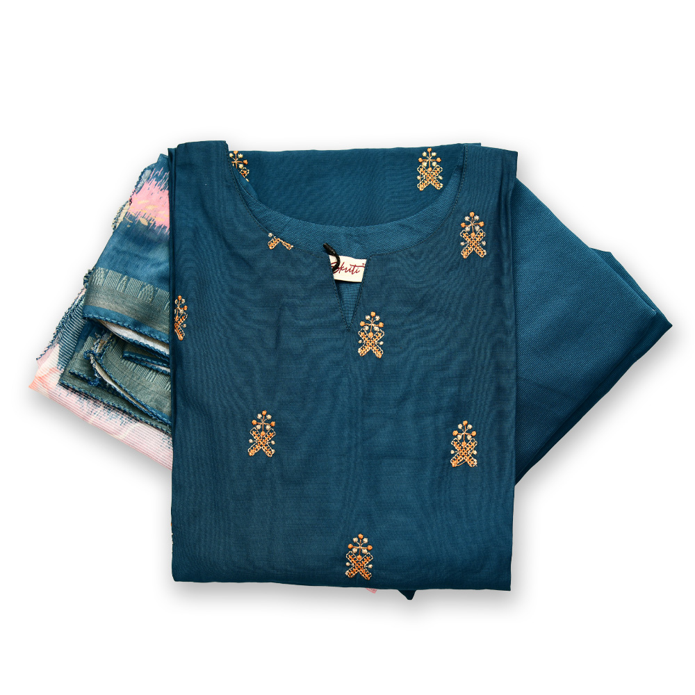 Elevate your ethnic wardrobe with this beautifully designed salwar suit set. The kurta’s straight silhouette and delicate notched neckline provide timeless elegance. Golden embroidery on the sleeve cuffs and scattered floral motifs add a charming touch, complemented perfectly by a soft, lightweight dupatta and matching pants.