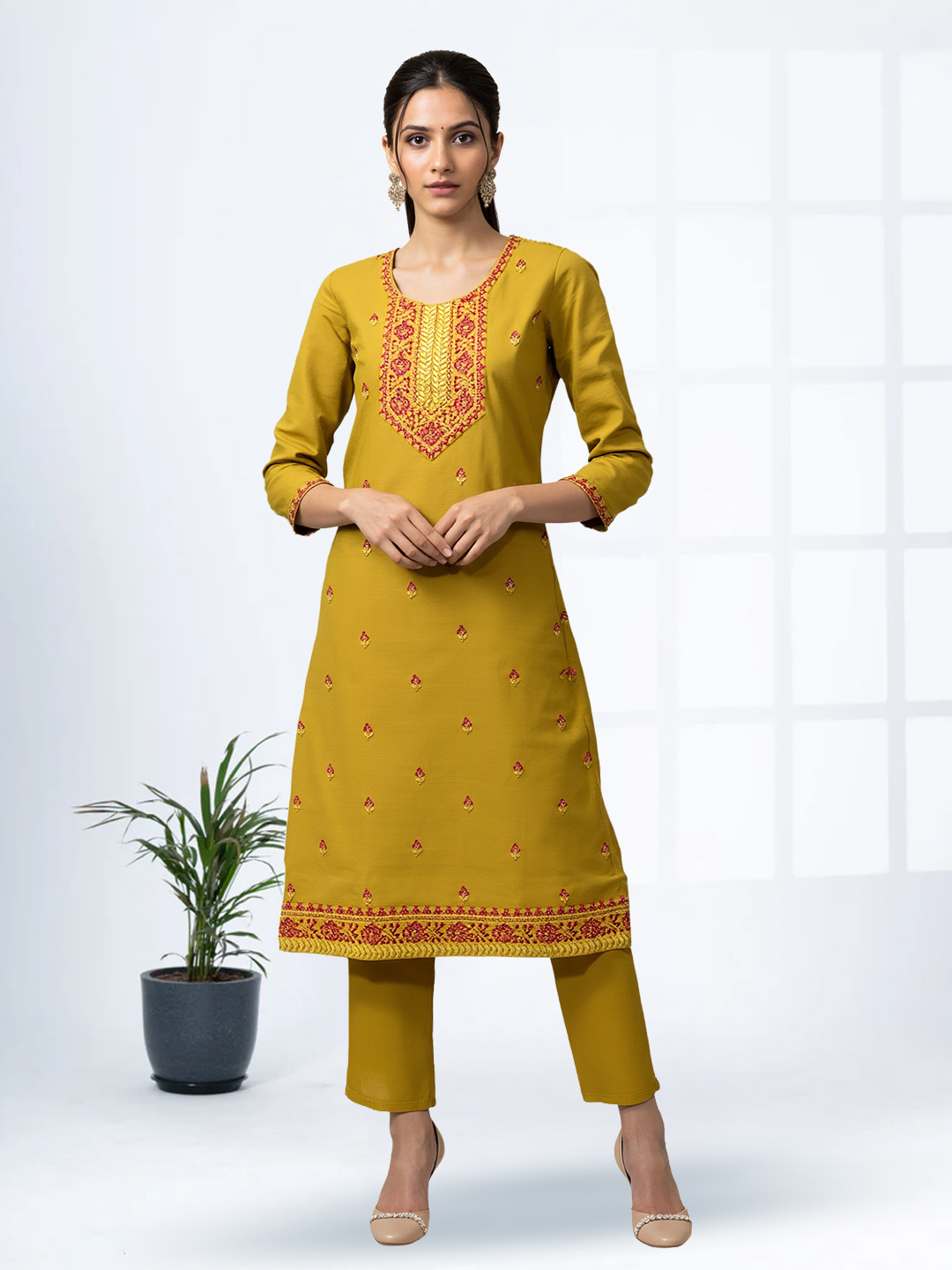 Look effortlessly graceful in this ethnic embroidered salwar suit set. Crafted from premium quality fabric, it offers all-day comfort without compromising style. The intricate embroidery and round neckline create a timeless look, while the traditional dupatta completes your ethnic ensemble beautifully.