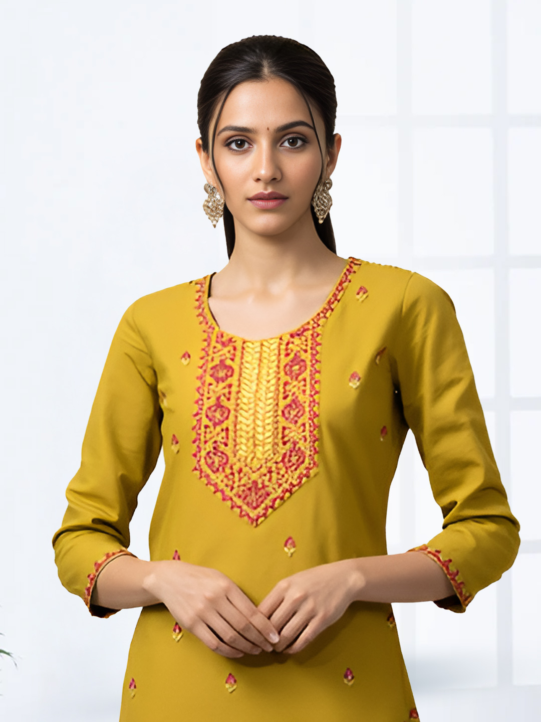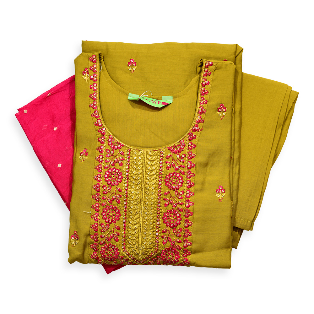 Bring home the charm of tradition with this eye-catching salwar suit set. The vivid embroidery paired with a classic round neckline ensures you shine effortlessly. Made from premium fabric and paired with a traditional dupatta, it’s an ideal choice for festive gatherings or family celebrations.