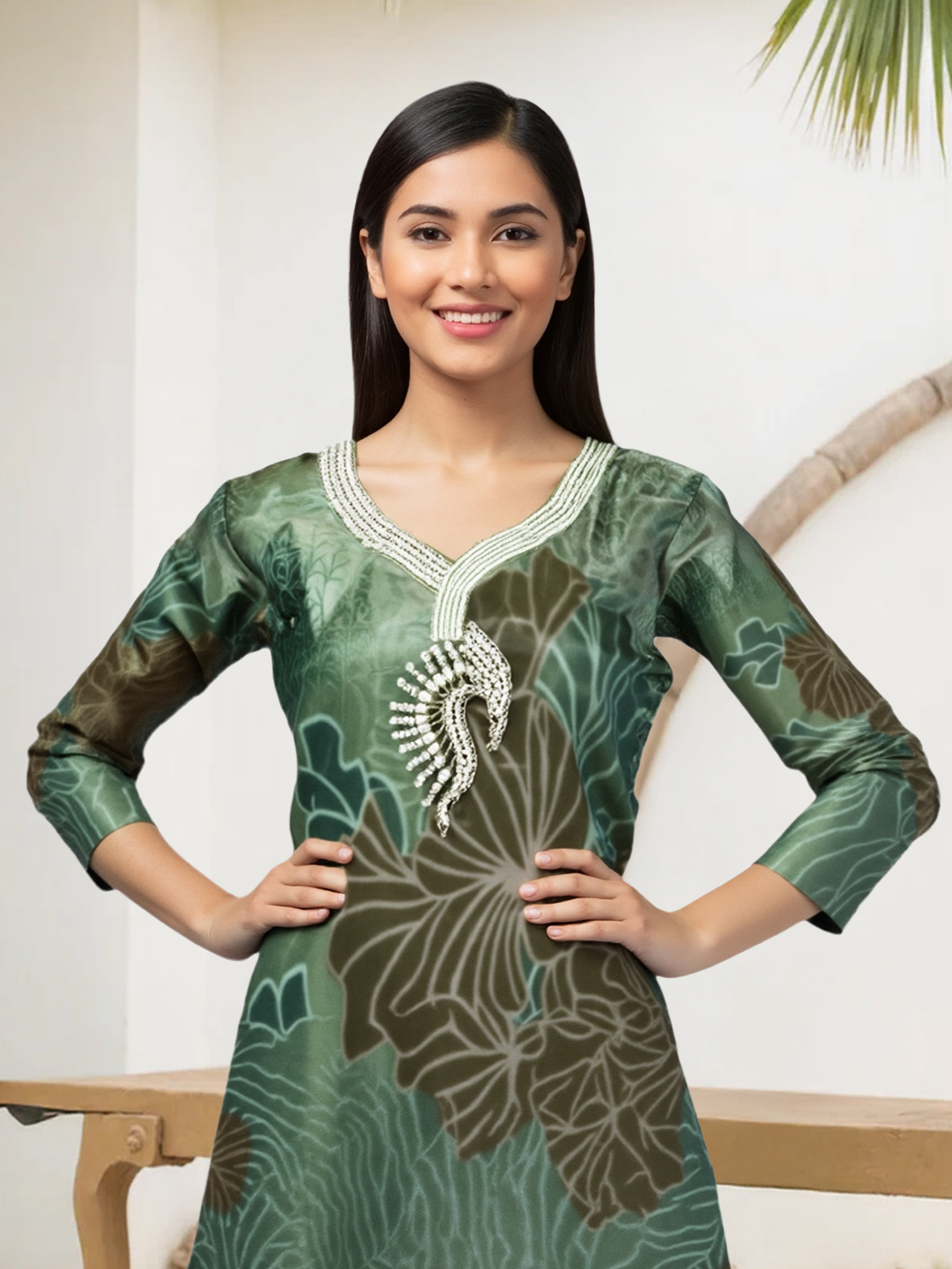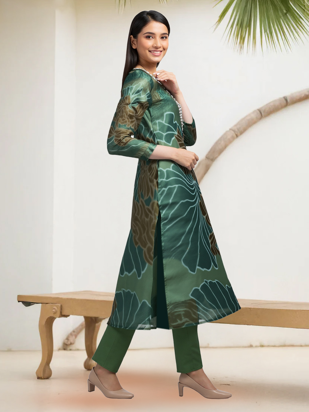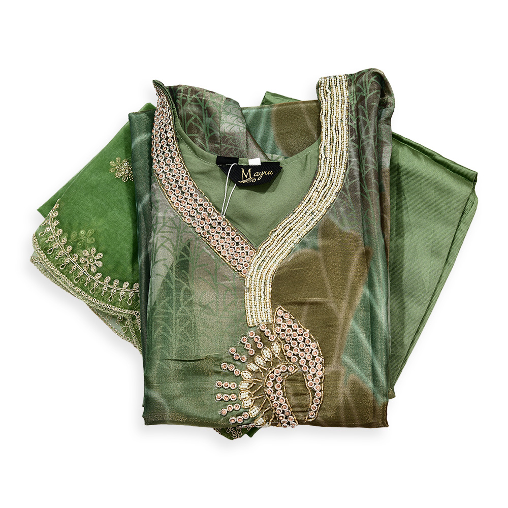 Intricate pearl-like beads trace the borders of the kurta and dupatta, creating a luxurious shimmer with every movement. These accents elevate the outfit with subtle glamour, making it perfect for festive and special occasions.