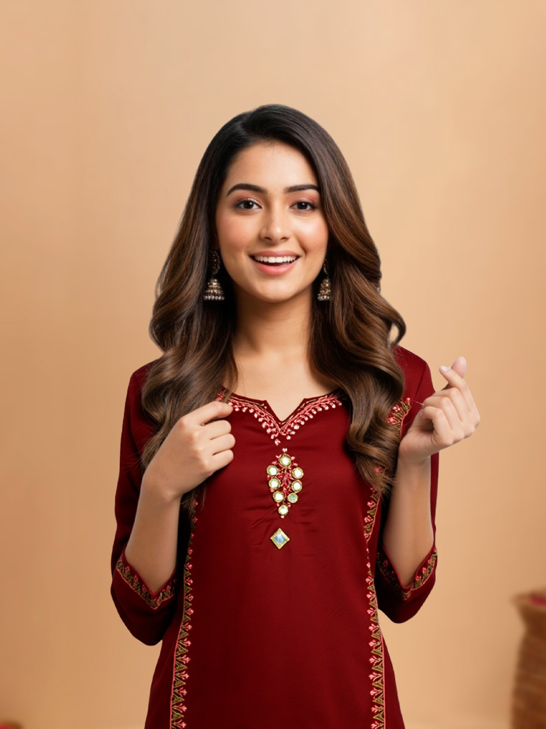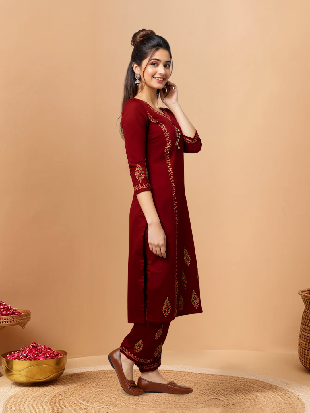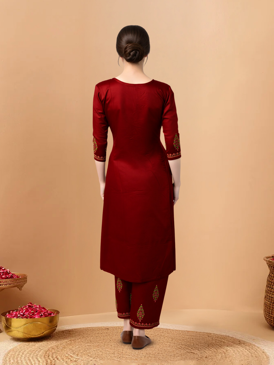 Embrace classic ethnic charm with this elegant kurta and pant set, beautifully adorned with embroidered floral motifs. The intricate detailing along the hemline, neckline, and sleeves adds a refined and graceful touch to the overall design.