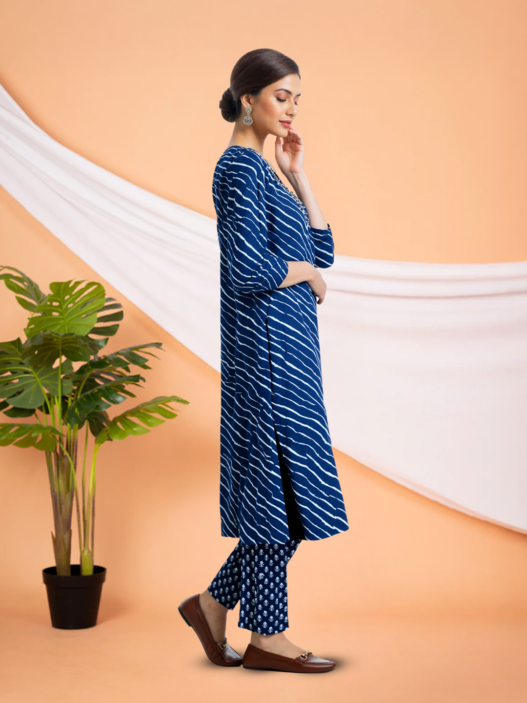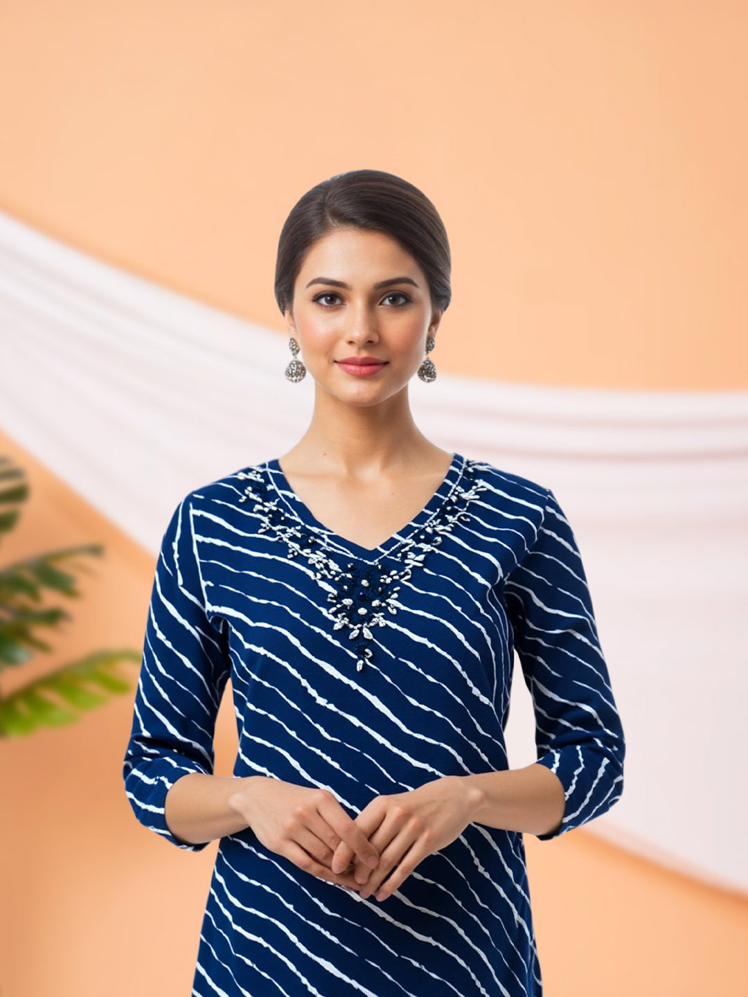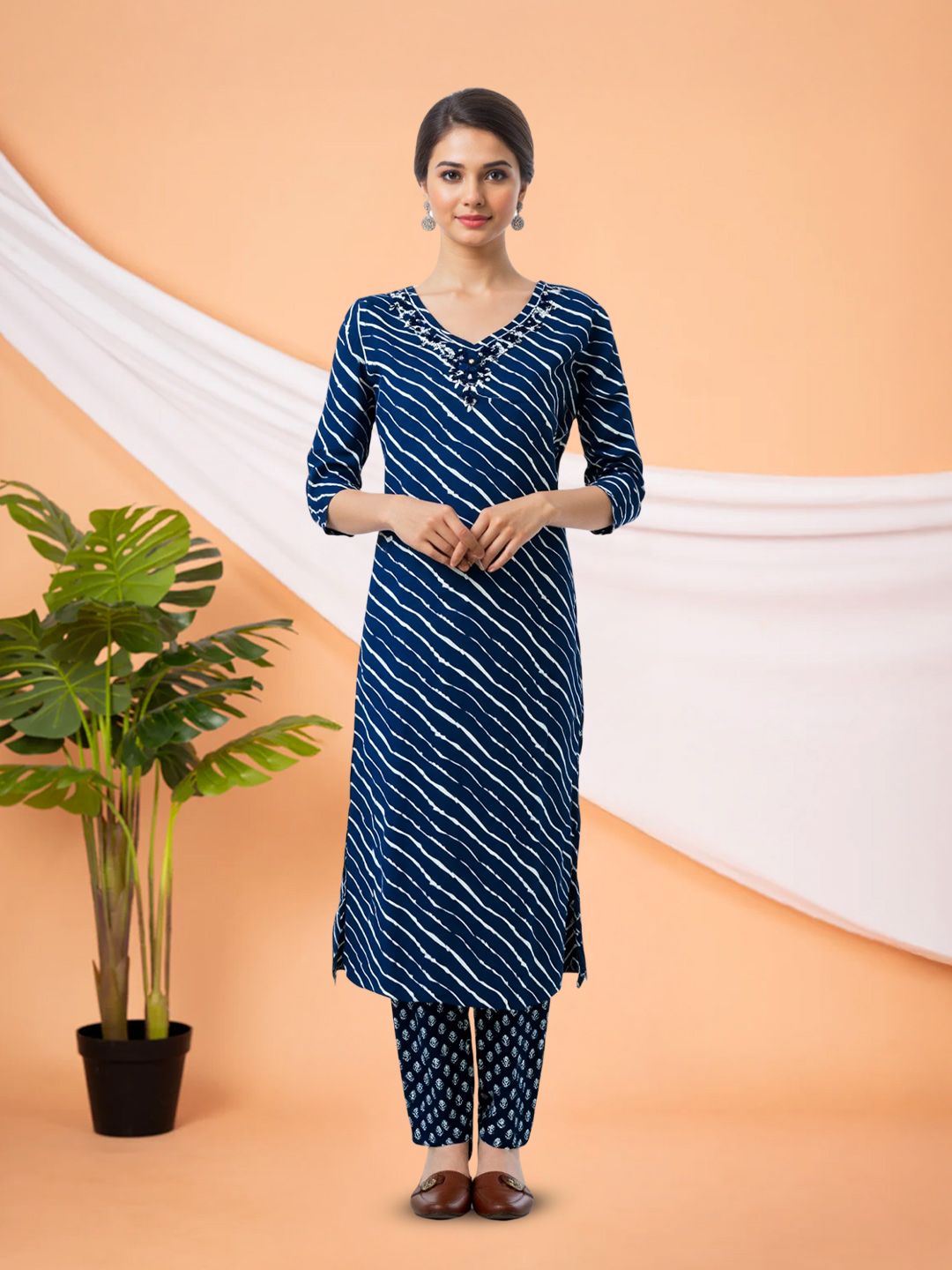 Step into effortless style with this V-neckline salwar suit set. The kurta features diagonal stripes in soothing blue and white, accented with floral motifs and small embellishments. Paired with three-quarter sleeves, printed matching pants, and a border-detailed dupatta, this set offers a perfect mix of traditional elegance and modern comfort.