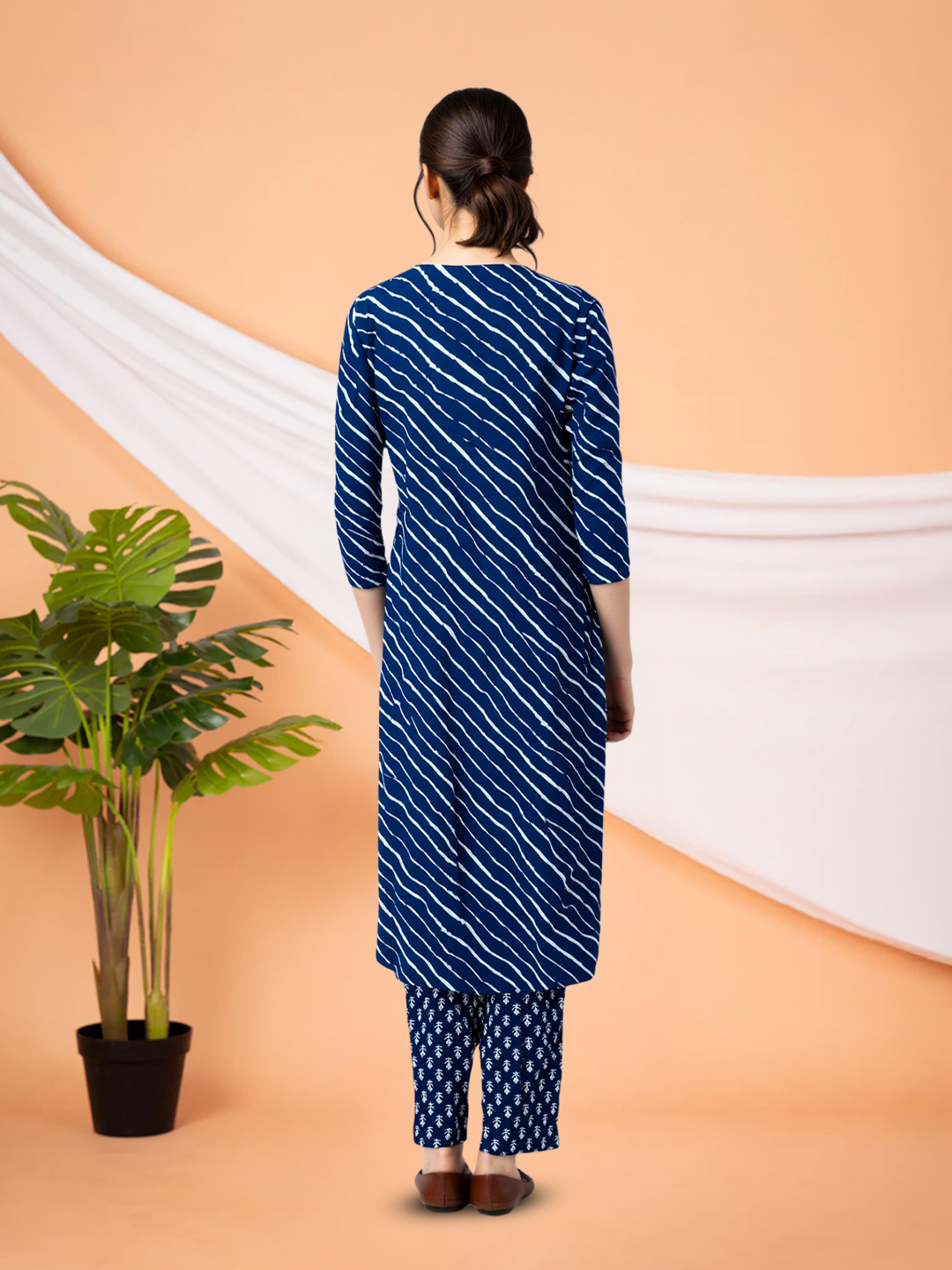 This elegant salwar suit set combines traditional charm with contemporary details. The blue-and-white diagonal striped kurta features delicate floral motifs and subtle embellishments around the flattering V-neckline. Three-quarter sleeves and matching printed pants create a balanced, graceful silhouette, completed with a blue dupatta featuring a detailed border.