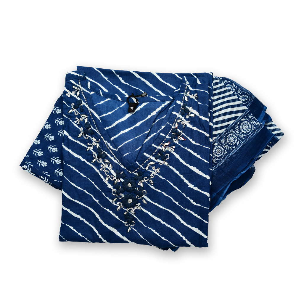 This beautifully designed salwar suit set blends classic and modern elements. The kurta’s blue-and-white diagonal stripes and floral embroidery around the V-neckline create a refined ethnic appeal. Coordinated printed pants and a detailed dupatta complete a harmonious ensemble suitable for both day and evening events.