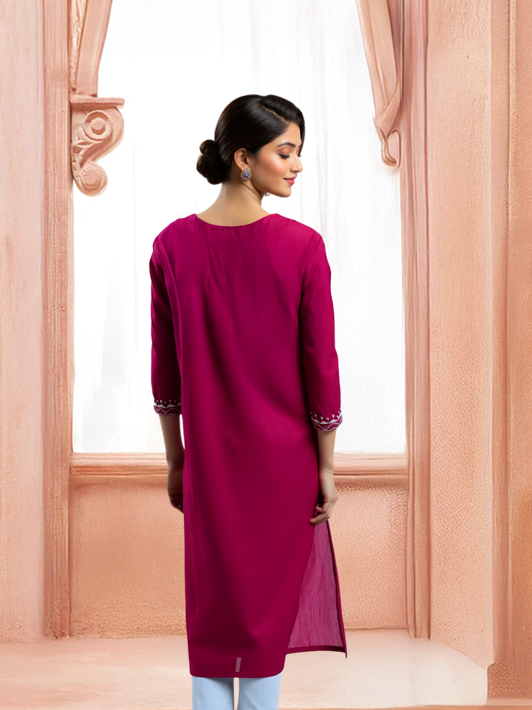 Designed with a straight cut fit, this kurta creates a flattering and elongated silhouette, making it perfect for all body types. The clean lines and subtle tailoring offer a comfortable yet chic look, ideal for those who appreciate both style and ease. Plus, the three-quarter sleeves with matching embroidery add a unique touch to your outfit.