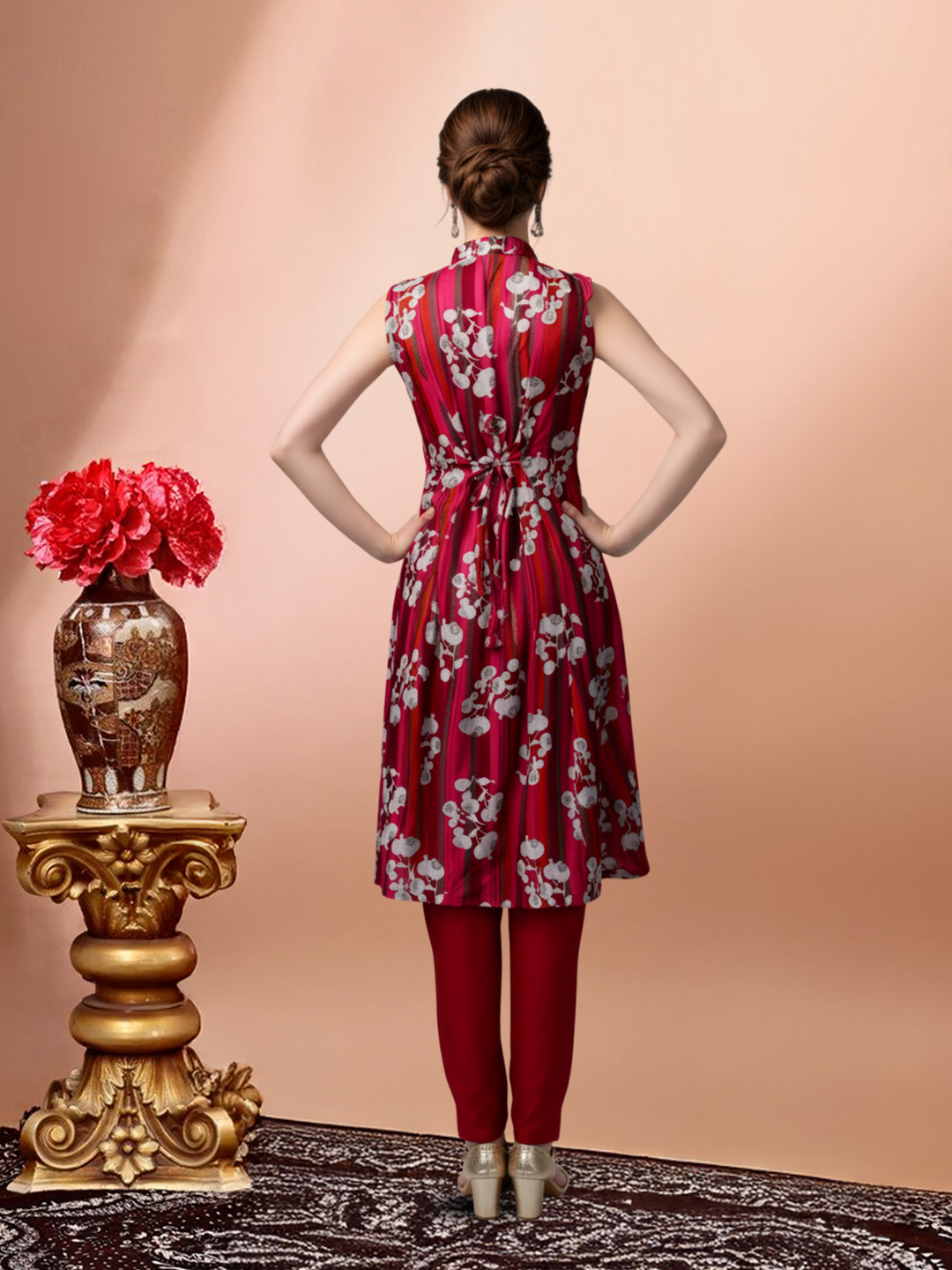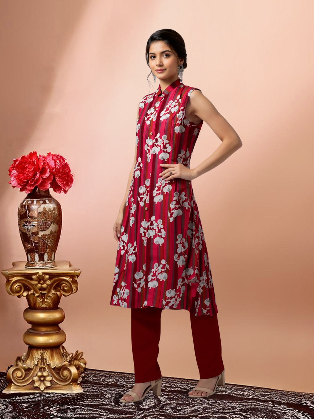 Add a touch of floral elegance to your wardrobe with the Elegant Floral Print Sleeveless Kurta with Pant Set. The mandarin collar brings a sleek, stylish edge to the design, while the bold floral print adds a pop of color and charm. The 3/4 sleeves offer a comfortable and practical fit, and the matching straight pant creates a polished, modern silhouette. Crafted from comfortable fabric, this set is perfect for both casual outings and more formal gatherings where you want to look effortlessly chic.