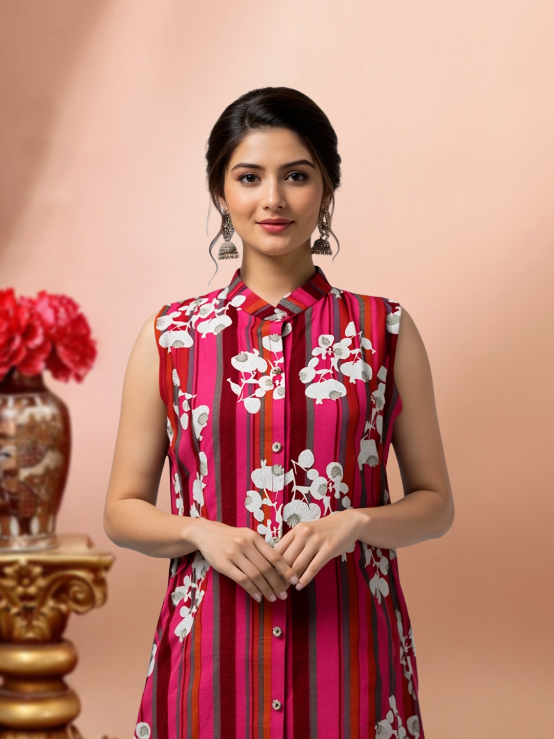This Elegant Floral Print Sleeveless Kurta with Pant Set combines modern style with traditional elegance. The mandarin collar adds a chic, structured touch to the kurta, while the vibrant floral print brings a refreshing, lively vibe to the ensemble. The 3/4 sleeves offer just the right amount of coverage, and the matching straight pant completes the look with a sleek, flattering fit. Crafted from comfortable fabric, this set is perfect for casual gatherings, festive events, or anytime you want to add a bit of charm to your wardrobe.