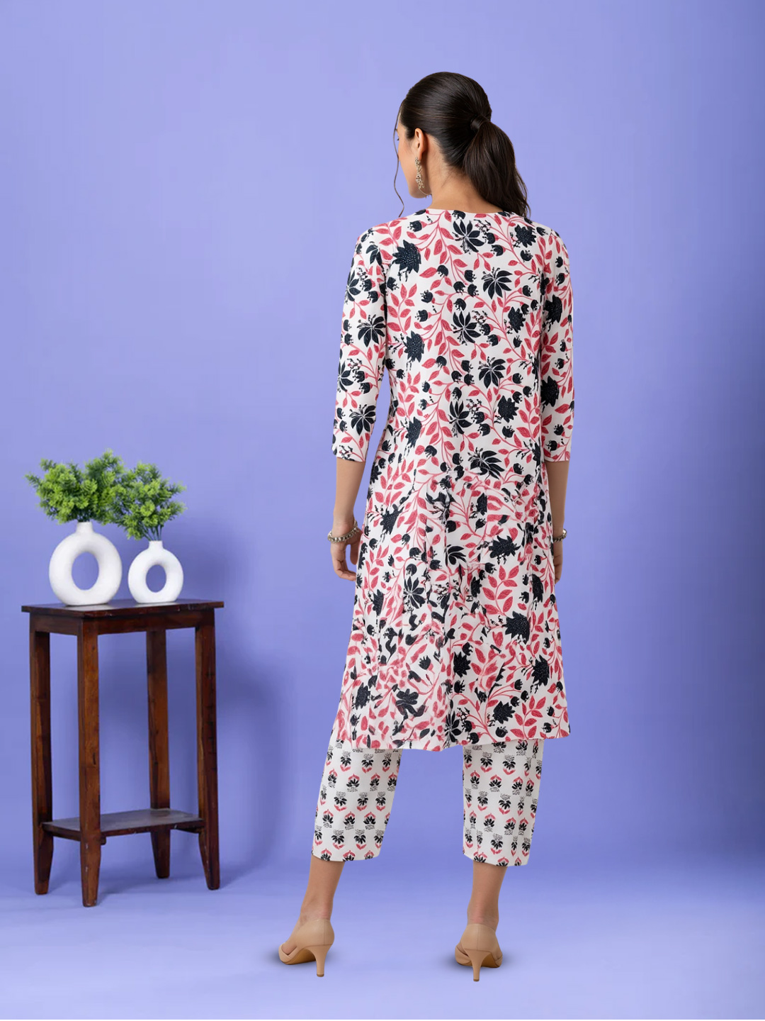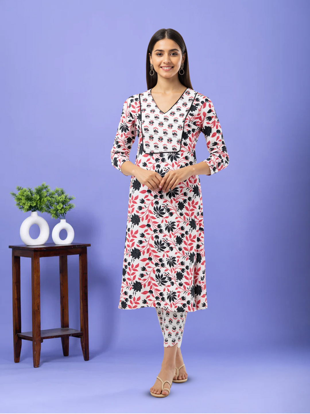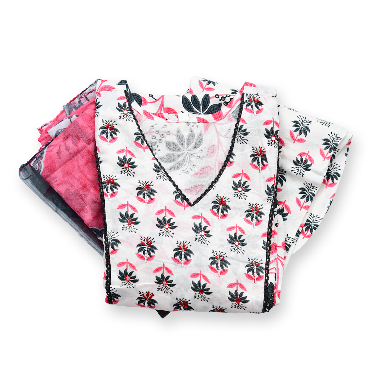 This set features a beautiful floral print kurta with a straight-cut silhouette that flatters all body types. Crafted from premium fabric for a comfortable fit, the matching pants and dupatta complete the look, making it an ideal choice for work, brunches, or family occasions.