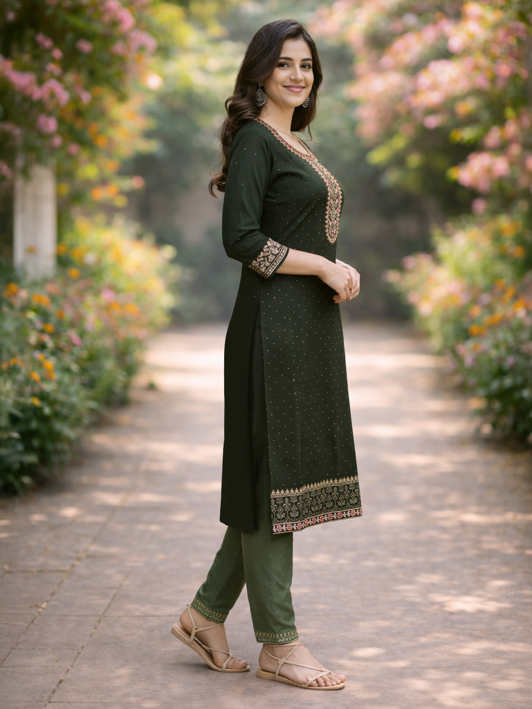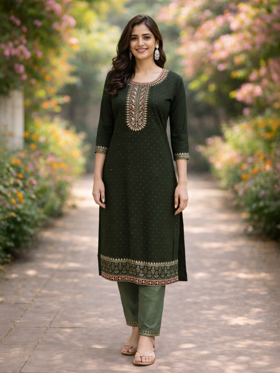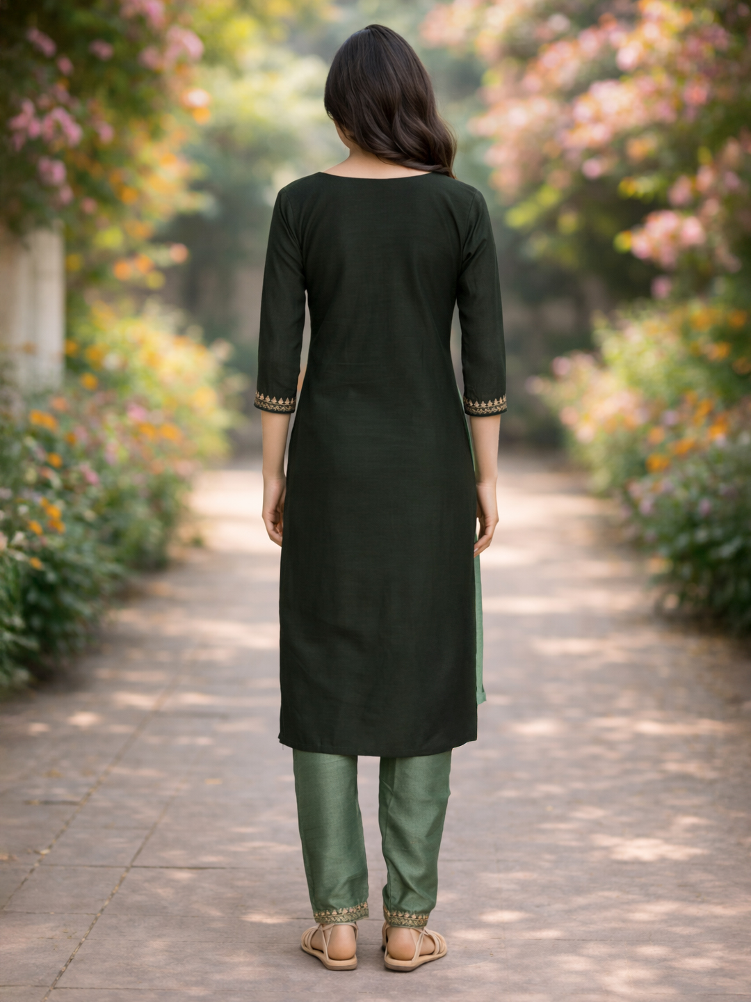 | Pant Type | Matching churidar pants with coordinated embroidery |