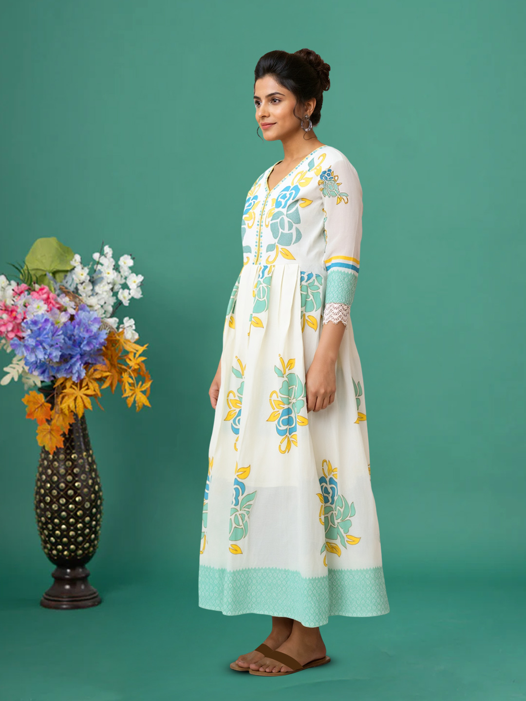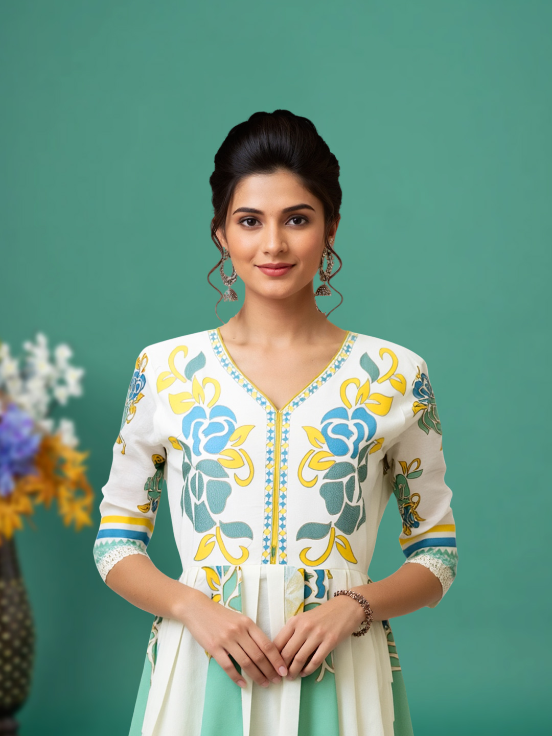 Embrace the best of both worlds with this Elegant Floral V-Neckline Anarkali Kurta. The modern V-neckline brings a touch of sophistication, while the Anarkali silhouette maintains its timeless charm. The chic three-quarter sleeves are perfect for year-round wear, and the soft floral print evokes a sense of effortless beauty, ideal for both casual and festive occasions.