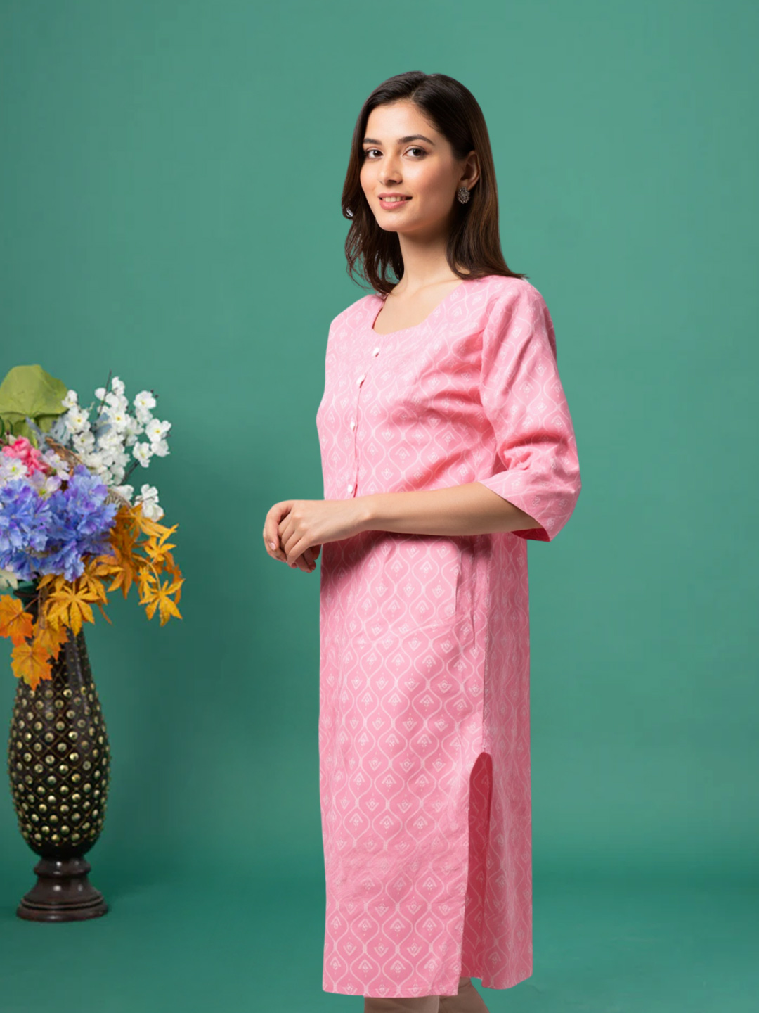 This elegant geometric print kurta combines the best of traditional and modern design. The round neck and 3/4 sleeves provide a timeless, versatile fit, while the soft, high-quality fabric ensures you stay comfortable through long hours of wear. A perfect choice for anyone who wants a fashionable yet easy-to-wear option for everyday style.