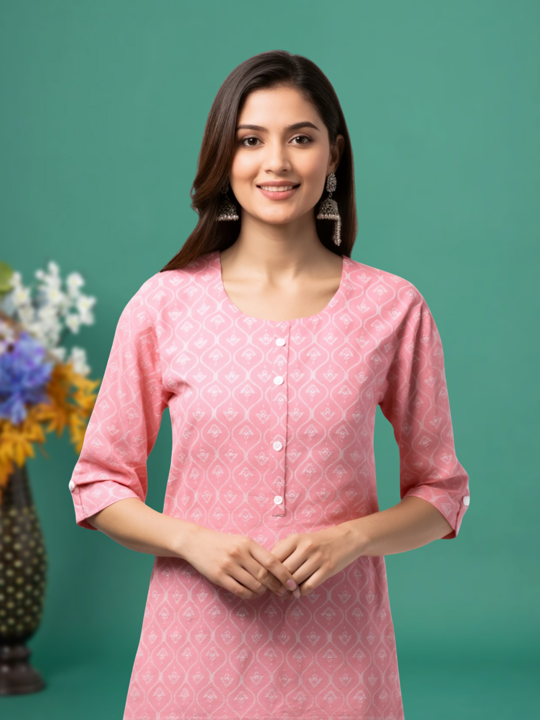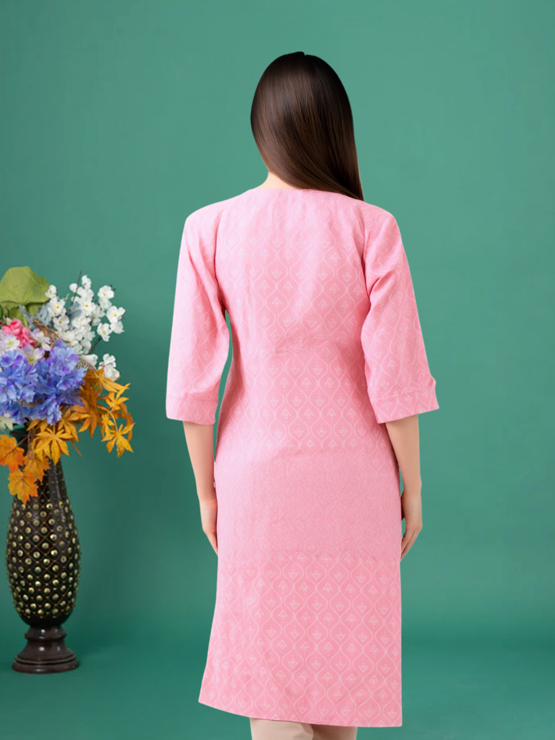 Elevate your wardrobe with this elegantly designed kurta featuring a chic geometric print. Its timeless round neck and 3/4 sleeves make it an ideal choice for both casual and semi-formal settings. Crafted from premium-quality fabric, this kurta ensures maximum comfort while offering a refined, stylish look for everyday wear.